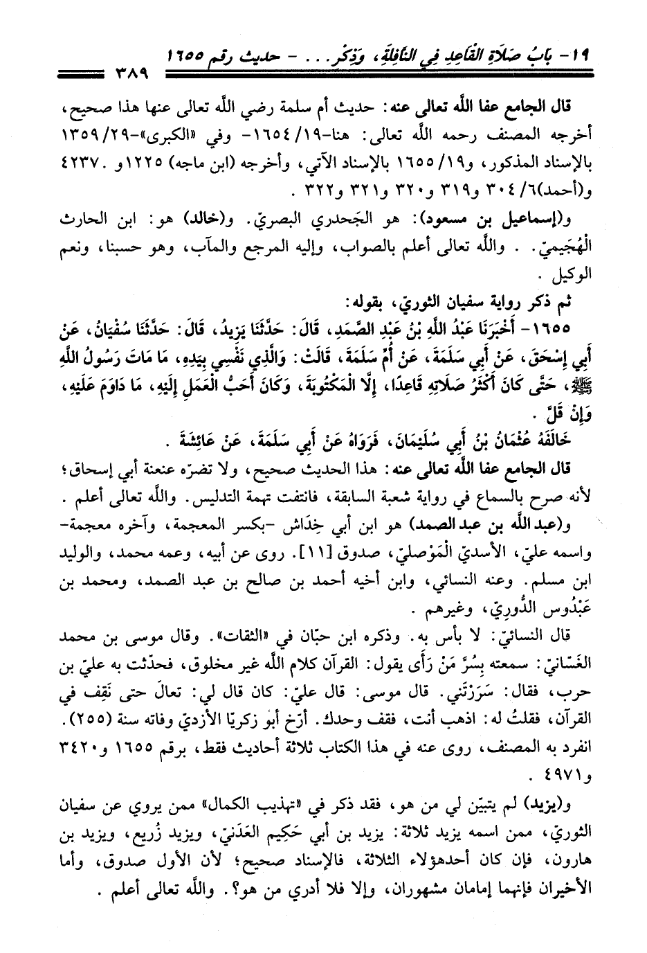 1655 - أَخْبَرَنَا عَبْدُ اللَّهِ بْنُ عَبْدِ الصَّمَدِ, قَالَ: حَدَّثَنَا يَزِيدُ, قَالَ: حَدَّثَنَا سُفْيَانُ, عَنْ أَبِي إِسْحَاقَ, عَنْ أَبِي سَلَمَةَ, عَنْ أُمِّ سَلَمَةَ, قَالَتْ: وَالَّذِى نَفْسِي بِيَدِهِ, مَا مَاتَ رَسُولُ اللَّهِ - صلى اللَّه عليه وسلم -, حَتَّى كَانَ أَكْثَرُ صَلاَتِهِ قَاعِدًا, إِلاَّ الْمَكْتُوبَةَ, وَكَانَ أَحَبُّ الْعَمَلِ إِلَيْهِ, مَا دَاوَمَ عَلَيْهِ, وَإِنْ قَلَّ.