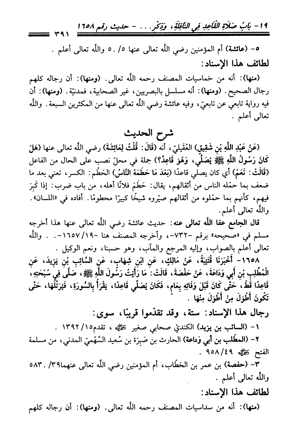 1658 - أَخْبَرَنَا قُتَيْبَةُ, عَنْ مَالِكٍ, عَنِ ابْنِ شِهَابٍ, عَنِ السَّائِبِ بْنِ يَزِيدَ, عَنِ الْمُطَّلِبِ بْنِ أَبِي وَدَاعَةَ, عَنْ حَفْصَةَ, قَالَتْ: مَا رَأَيْتُ رَسُولَ اللَّهِ - صلى اللَّه عليه وسلم -, صَلَّى فِي سُبْحَتِهِ, قَاعِدًا قَطُّ, حَتَّى كَانَ قَبْلَ وَفَاتِهِ بِعَامٍ, فَكَانَ يُصَلِّي قَاعِدًا, يَقْرَأُ بِالسُّورَةِ, فَيُرَتِّلُهَا, حَتَّى تَكُونَ أَطْوَلَ مِنْ أَطْوَلَ مِنْهَا.