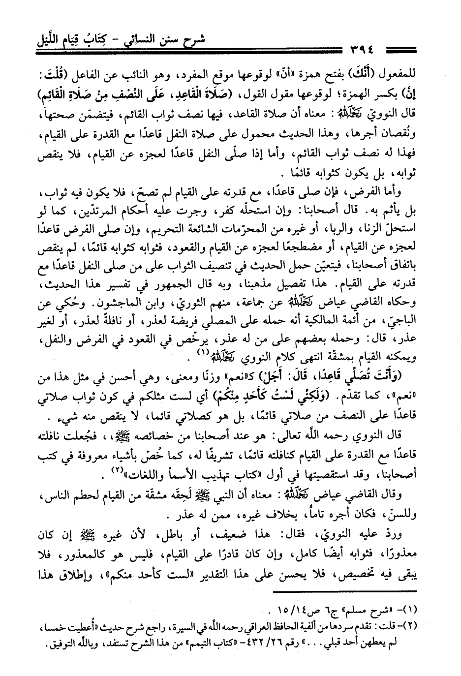 للمفعول (أَنَّكَ) بفتح همزة "أنّ" لوقوعها موقع المفرد، وهو النائب عن الفاعل (قُلْتَ: إنَّ) بكسر الهمزة؛ لوقوعها مقول القول، (صَلَاةَ الْقَاعِدِ, عَلَى النِّصْفِ مِنْ صَلَاةِ الْقَائِمِ) قال النووي -رَحِمَهُ اللَّهُ-: معناه أن صلاة القاعد، فيها نصف ثواب القائم، فيتضمّن صحتها، ونُقصان أجرها، وهذا الحديث محمول على صلاة النفل قاعدًا مع القدرة على القيام، فهذا له نصف ثواب القائم، وأما إذا صلّى النفل قاعدًا لعجزه عن القيام، فلا ينقص ثوابه، بل يكون كثوابه قائمًا.
