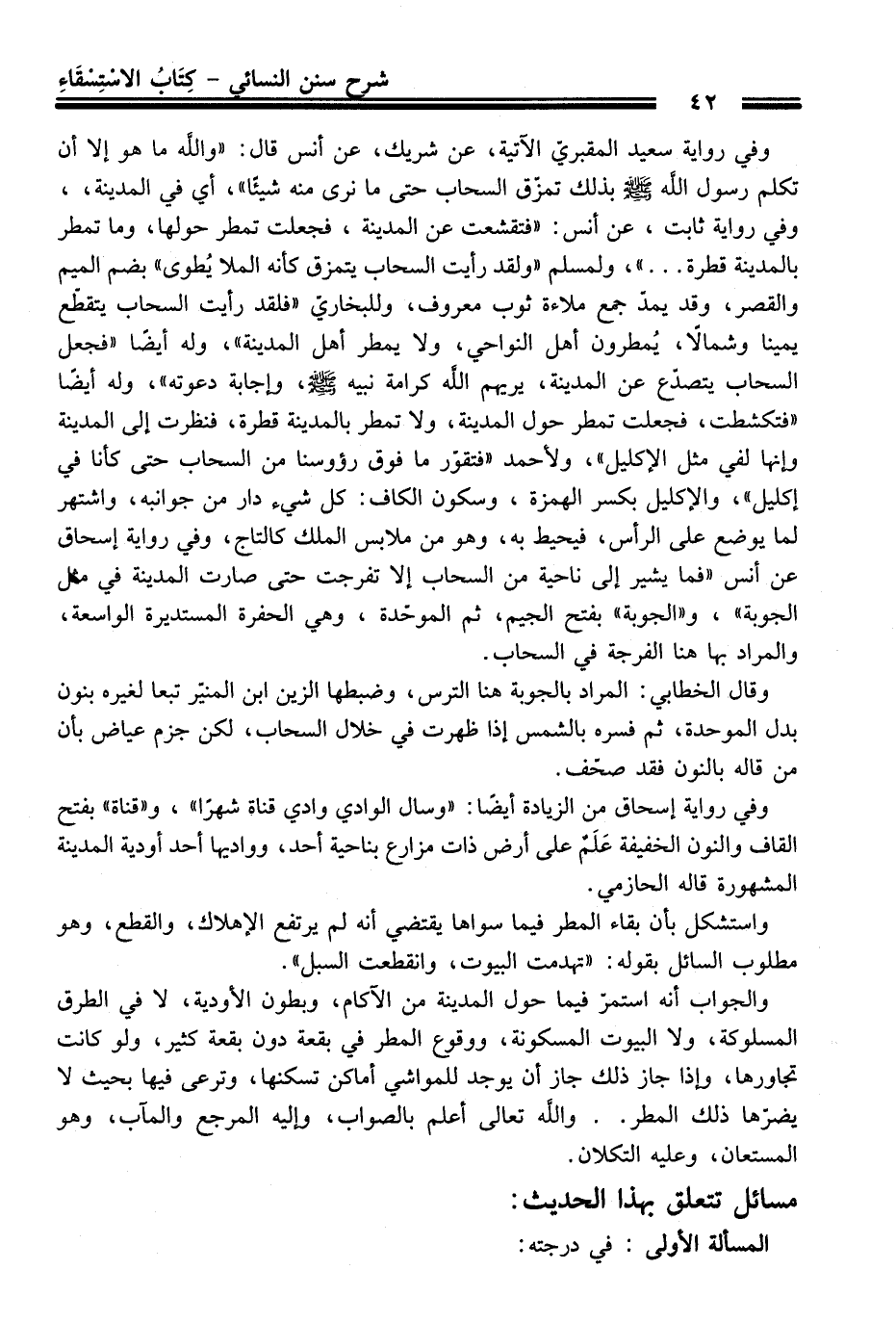 والجواب أنه استمر فيما حول المدينة من الآكام، وبطون الأودية، لا في الطرق المسلوكة، ولا البيوت المسكونة، ووقوع المطر في بقعة دون بقعة كثير، ولو كانت تجاورها، وإذا جاز ذلك جاز أن يوجد للمواشي أماكن تسكنها، وترعى فيها بحيث لا يضرّها ذلك المطر .. واللَّه تعالى أعلم بالصواب، وإليه المرجع والمآب، وهو المستعان، وعليه التكلان.
