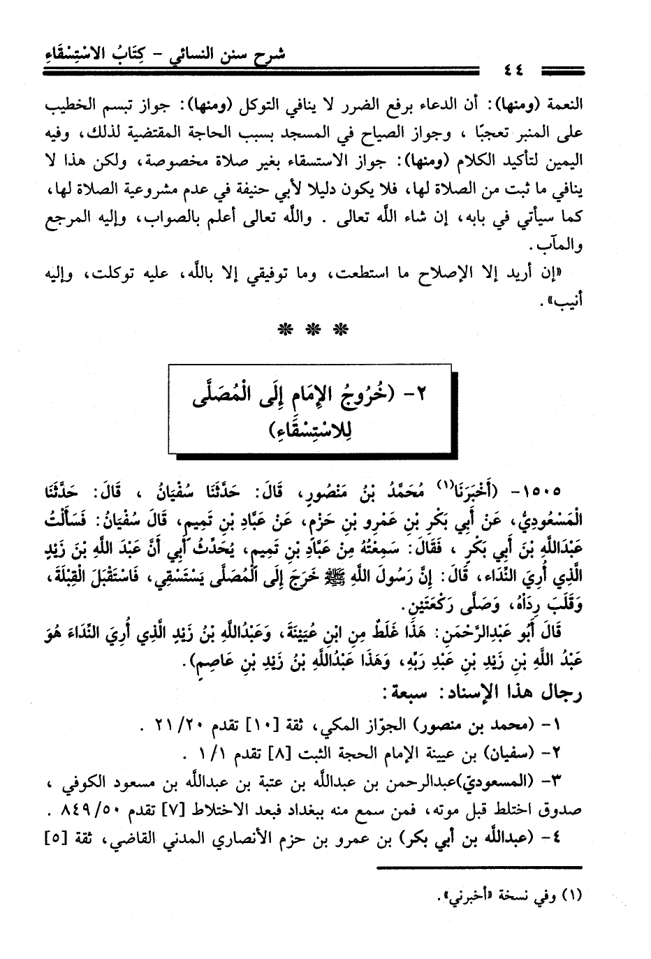 1505 - (أَخْبَرَنَا (¬1) مُحَمَّدُ بْنُ مَنْصُورٍ, قَالَ: حَدَّثَنَا سُفْيَانُ, قَالَ: حَدَّثَنَا الْمَسْعُودِيُّ عَنْ أَبِي بَكْرِ بْنِ عَمْرِو بْنِ حَزْمٍ, عَنْ عَبَّادِ بْنِ تَمِيمٍ, قَالَ سُفْيَانُ: فَسَأَلْتُ عَبْدَ اللَّهِ بْنَ أَبِي بَكْرٍ, فَقَالَ: سَمِعْتُهُ مِنْ عَبَّادِ بْنِ تَمِيمٍ, يُحَدِّثُ أَبِي أَنَّ عَبْدَ اللَّهِ بْنَ زَيْدٍ الَّذِي أُرِيَ النِّدَاءَ, قَالَ: إِنَّ رَسُولَ اللَّهِ - صلى اللَّه عليه وسلم - خَرَجَ إِلَى الْمُصَلَّى يَسْتَسْقِي, فَاسْتَقْبَلَ الْقِبْلَةَ, وَقَلَبَ رِدَاءَهُ, وَصَلَّى رَكْعَتَيْنِ.