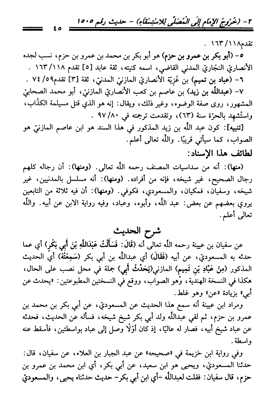 عن سفيان بن عيينة -رحمه اللَّه تعالى- أنه (قَالَ: فَسَأَلْتُ عَبدَ اللَّهِ بْنَ أَبِي بَكْرِ) أي عفا حدثه به المسعوديّ، عن أبيه (فَقَالَ) أي عبد اللَّه بن أبي بكر (سَمِعْتُهُ) أي الحديث المذكور (مِنْ عَبَّادِ بْنِ تَمِيمٍ) المازني (يُحَدَّثَ أَبِي) جملة في محل نصب على الحال، هكذا في النسخة الهندية، وهو الصواب، ووقع في النسختين المطبوعتين: "يحدث عن أبي" بزيادة "عن" وهو غلط.