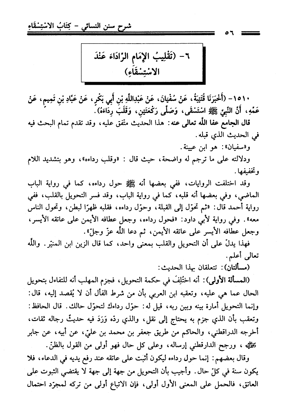 1510 - (أَخْبَرَنَا قُتَيْبَةُ, عَنْ سُفْيَانَ, عَنْ عَبْدِ اللَّهِ بْنِ أَبِي بَكْرٍ, عَنْ عَبَّادِ بْنِ تَمِيمٍ, عَنْ عَمِّهِ, أَنَّ النَّبِيَّ - صلى اللَّه عليه وسلم - اسْتَسْقَى, وَصَلَّى رَكْعَتَيْنِ, وَقَلَبَ رِدَاءَهُ).