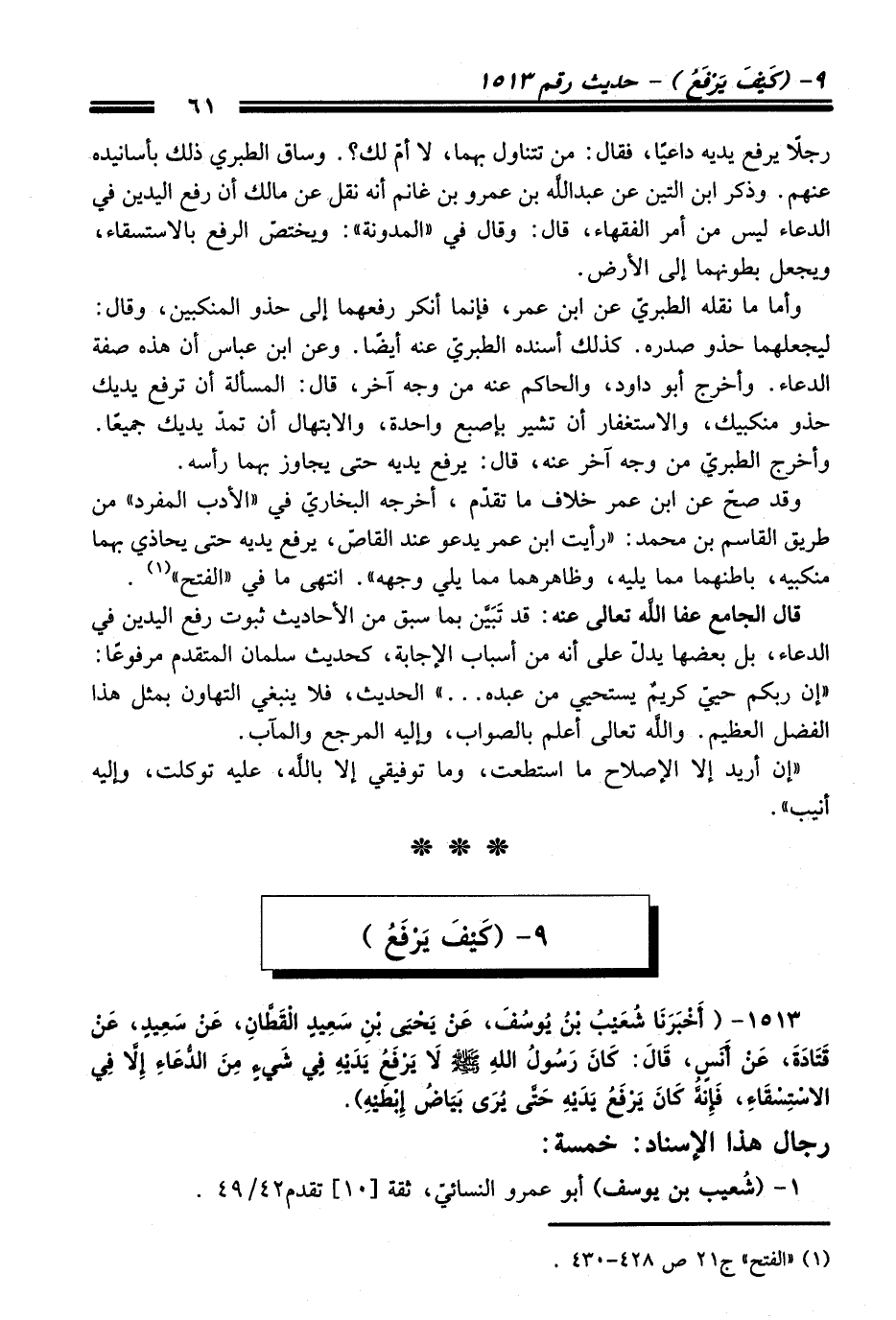 قال الجامع - عفا اللَّه تعالى عنه -: قد تَبَيَّن بما سبق من الأحاديث ثبوت رفع اليدين في الدعاء، بل بعضها يدلّ على أنه من أسباب الإجابة، كحديث سلمان المتقدم مرفوعًا: "إن ربكم حييّ كريمٌ يستحيي من عبده ... " الحديث، فلا ينبغي التهاون بمثل هذا الفضل العظيم. واللَّه تعالى أعلم بالصواب، وإليه المرجع والمآب.