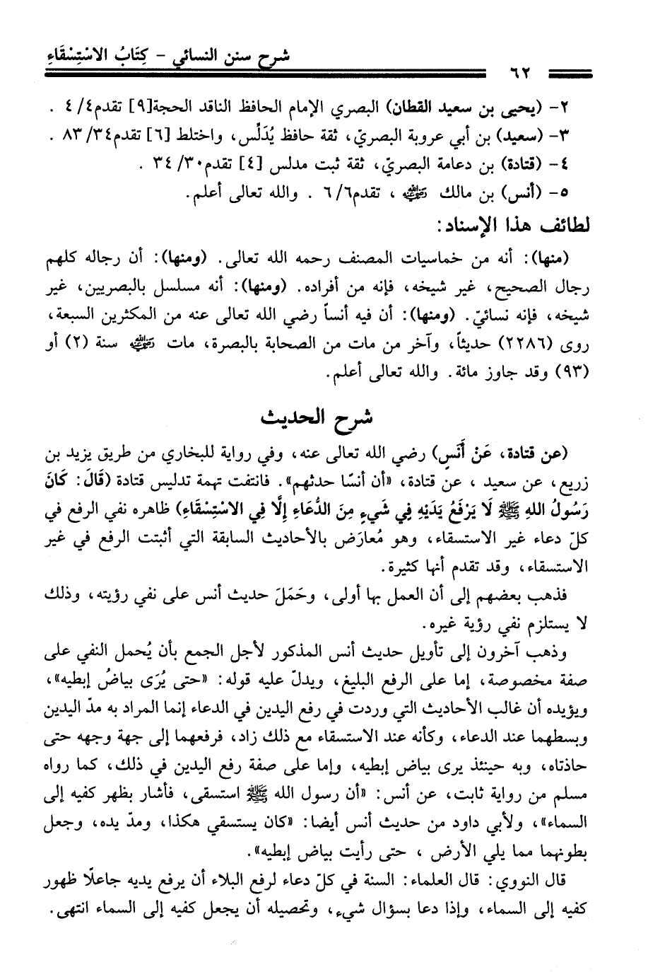 (عن قتادة، عَنْ أَنَسٍ) - رضي اللَّه تعالى عنه -، وفي رواية للبخاري من طريق يزيد بن زريع، عن سعيد، عن قتادة، "أن أنسًا حدثهم،. فانتفت تهمة تدليس قتادة (قَالَ: كَانَ رَسُولُ اللَّهِ - صلى الله عليه وسلم - لَا يَرْفَعُ يَدَيْهِ فِي شَيءٍ مِنَ الدُّعَاءِ إِلاَّ فِي الاسْتِسْقَاءِ) ظاهره نفي الرفع في كلّ دعاء غير الاستسقاء، وهو مُعارَض بالأحاديث السابقة التي أثبتت الرفع في غير الاستسقاء، وقد تقدم أنها كثيرة.