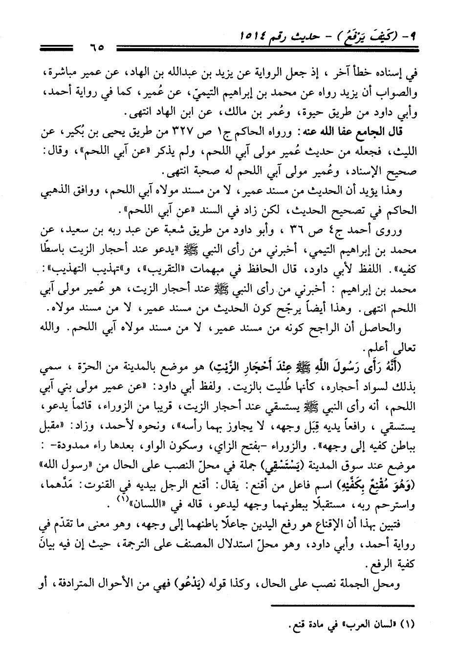 وروى أحمد ج 4 ص 36، وأبو داود من طريق شعبة عن عبد ربه بن سعيد، عن محمد بن إبراهيم التيمي، أخبرني من رأى النبي - صلى الله عليه وسلم - "يدعو عند أحجار الزيت باسطًا كفيه". اللفظ لأبي داود، قال الحافظ في مبهمات "التقريب"، و"تهذيب التهذيب": محمد بن إبراهيم: أخبرني من رأى النبي - صلى الله عليه وسلم - عند أحجار الزيت، هو عُمير مولى آبي اللحم انتهى. وهذا أيضًا يرجّح كون الحديث من مسند عمير، لا من مسند مولاه.