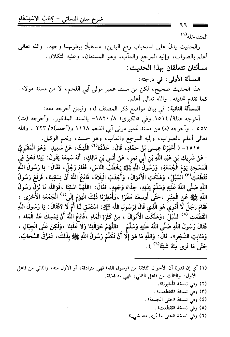 1515 - (أَخْبَرَنَا عِيسَى بْنُ حَمَّادٍ, قَالَ: حَدَّثَنَا (¬2) اللَّيْثُ, عَنْ سَعِيدٍ- وَهُوَ الْمَقْبُرِيُّ -عَنْ شَرِيكِ بْنِ عَبْدِ اللَّهِ بْنِ أَبِي نَمِرٍ, عَنْ أَنَسِ بْنِ مَالِكٍ, أَنَّهُ سَمِعَهُ يَقُولُ: بَيْنَا نَحْنُ فِي الْمَسْجِدِ يَوْمَ الْجُمُعَةِ, وَرَسُولُ اللَّهِ - صلى اللَّه عليه وسلم - يَخْطُبُ النَّاسَ, فَقَامَ رَجُلٌ, فَقَالَ: يَا رَسُولَ اللَّهِ تَقَطَّعَتِ (¬3) السُّبُلُ, وَهَلَكَتِ الأَمْوَالُ, وَأَجْدَبَ الْبِلاَدُ, فَادْعُ اللَّهَ أَنْ يَسْقِيَنَا, فَرَفَعَ رَسُولُ اللَّهِ - صلى اللَّه عليه وسلم - يَدَيْهِ, حِذَاءَ وَجْهِهِ, فَقَالَ: «اللَّهُمَّ اسْقِنَا, فَوَاللَّهِ مَا نَزَلَ رَسُولُ اللَّهِ - صلى اللَّه عليه وسلم - عَنِ الْمِنْبَرِ, حَتَّى أُوسِعْنَا مَطَرًا, وَأُمْطِرْنَا ذَلِكَ الْيَوْمَ إِلَى (¬4) الْجُمُعَةِ الأُخْرَى, فَقَامَ رَجُلٌ لاَ أَدْرِي هُوَ الَّذِي قَالَ: لِرَسُولِ اللَّهِ - صلى اللَّه عليه وسلم -: اسْتَسْقِ لَنَا أَمْ لاَ؟ فَقَالَ: يَا رَسُولَ اللَّهِ انْقَطَعَتِ (¬5) السُّبُلُ, وَهَلَكَتِ الأَمْوَالُ, مِنْ كَثْرَةِ الْمَاءِ, فَادْعُ اللَّهَ أَنْ يُمْسِكَ عَنَّا الْمَاءَ, فَقَالَ رَسُولُ اللَّهِ - صلى اللَّه عليه وسلم -: «اللَّهُمَّ حَوَالَيْنَا وَلاَ عَلَيْنَا, وَلَكِنْ عَلَى الْجِبَالِ, وَمَنَابِتِ الشَّجَرِ». قَالَ: وَاللَّهِ مَا هُوَ إِلاَّ أَنْ تَكَلَّمَ رَسُولُ اللَّهِ - صلى اللَّه عليه وسلم - بِذَلِكَ, تَمَزَّقَ السَّحَابُ, حَتَّى مَا نَرَى مِنْهُ شَيْئًا (¬6)).