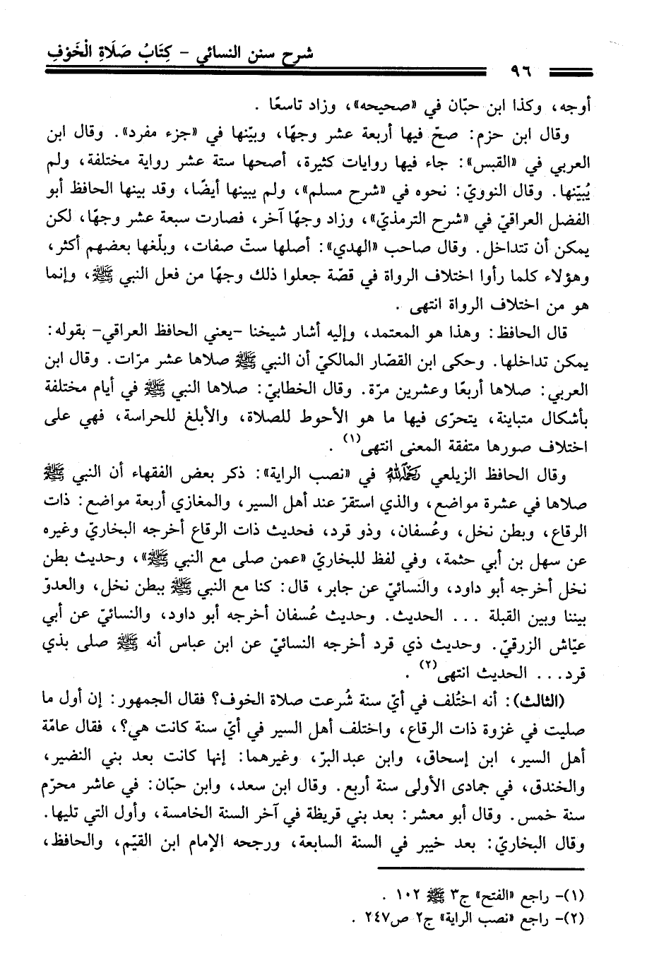 وقال الحافظ الزيلعي -رَحِمَهُ اللَّهُ- في "نصب الراية": ذكر بعض الفقهاء أن النبي - صلى اللَّه عليه وسلم - صلاها في عشرة مواضع، والذي استقر عند أهل السير، والمغازي أربعة مواضع: ذات الرقاع، وبطن نخل، وعُسفان، وذو قرد، فحديث ذات الرقاع أخرجه البخاريّ وغيره عن سهل بن أبي حثمة، وفي لفظ للبخاريّ "عمن صلى مع النبي - صلى اللَّه عليه وسلم - "، وحديث بطن نخل أخرجه أبو داود، والنّسائيّ عن جابر، قال: كنا مع النبي - صلى اللَّه عليه وسلم - ببطن نخل، والعدوّ بيننا وبين القبلة ... الحديث. وحديث عُسفان أخرجه أبو داود، والنسائيّ عن أبي عياش الزرقيّ. وحديث ذي قرد أخرجه النسائي عن ابن عباس أنه - صلى اللَّه عليه وسلم - صلى بذي قرد ... الحديث انتهى (¬2).