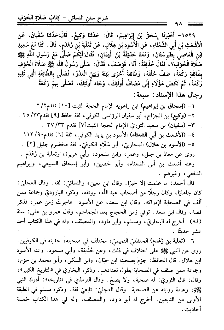 1529 - أَخْبَرَنَا إِسْحَاقُ بْنُ إِبْرَاهِيمَ, قَالَ: حَدَّثَنَا وَكِيعٌ, قَالَ: حَدَّثَنَا سُفْيَانُ, عَنِ الأَشْعَثِ بْنِ أَبِي الشَّعْثَاءِ, عَنِ الأَسْوَدِ بْنِ هِلاَلٍ, عَنْ ثَعْلَبَةَ بْنِ زَهْدَمٍ, قَالَ: كُنَّا مَعَ سَعِيدِ بْنِ الْعَاصِي بِطَبَرِسْتَانَ, وَمَعَنَا حُذَيْفَةُ بْنُ الْيَمَانِ, فَقَالَ: أَيُّكُمْ صَلَّى مَعَ رَسُولِ اللَّهِ - صلى اللَّه عليه وسلم - صَلاَةَ الْخَوْفِ؟ , فَقَالَ حُذَيْفَةُ: أَنَا, فَوَصَفَ, فَقَالَ: صَلَّى رَسُولُ اللَّهِ - صلى اللَّه عليه وسلم - صَلاَةَ الْخَوْفِ بِطَائِفَةٍ رَكْعَةً, صَفٍّ خَلْفَهُ, وَطَائِفَةٍ أُخْرَى بَيْنَهُ وَبَيْنَ الْعَدُوِّ, فَصَلَّى بِالطَّائِفَةِ الَّتِي تَلِيهِ رَكْعَةً, ثُمَّ نَكَصَ هَؤُلاَءِ إِلَى مَصَافِّ أُولَئِكَ, وَجَاءَ أُولَئِكَ, فَصَلَّى بِهِمْ رَكْعَةً.