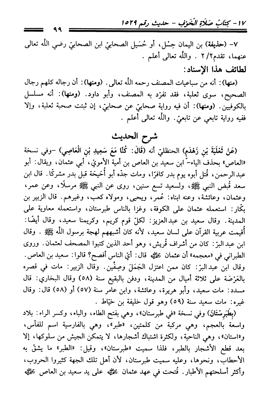 (عَنْ ثَعْلَبَةَ بْنِ زَهْدَمٍ) الحنظليّ أنه (قَالَ: كُنَّا مَعَ سَعِيدِ بْنِ الْعَاصِي) -وفي نسخة "العاص" بحذف الياء- ابن سعيد بن العاص بن أمية الأمويّ، أبي عثمان، ويقال: أبو عبد الرحمن، قُتل أبوه يوم بدر كافرًا، ومات جدّه أبو أُحَيحَة قبل بدر مشركًا. قال ابن سعد قُبض النبي - صلى اللَّه عليه وسلم -، ولسعيد تسع سنين، روى عن النبي - صلى اللَّه عليه وسلم - مرسلاً، وعن عمر، وعثمان، وعائشة، وعنه ابناه: عُمر، ويحيى، ومولاه كعب، وغيرهم. قال الزبير بن بكّار: استعمله عثمان على الكوفة، وغزا بالناس طبرستان، واستعمله معاوية على المدينة. وقال سعيد بن عبد العزيز: لكلّ قوم كريم، وكريمنا سعيد، وقال أيضًا: أُقيمت عربية القرآن عدى لسان سعيد, لأنه كان أشبههم لهجة برسول اللَّه - صلى اللَّه عليه وسلم -. وقال ابن عبد البرّ: كان من أشراف قُريش، وهو أحد الذين كتبوا المصحف لعثمان. وروى الطبراني في "معجمه" أن عثمان - رضي اللَّه عنه - قال: أيّ الناس أفصح؟ قالوا: سعيد بن العاص. وقال ابن عبد البرّ: كان ممن اعتزل الجَمَلَ وصِفِّين. وقال الزبير: مات في قصره بالعَرْصَة على ثلاثة أميال من المدينة، ودفن بالبقيع سنة (58) وقال البخاري: قال مسدد: مات سعيد، وأبو هريرة، وعائشة، وابن عامر سنة (57) أو (58) قال: وقال غيره: مات سعيد سنة (59) وهو قول خليفة بن خيّاط.