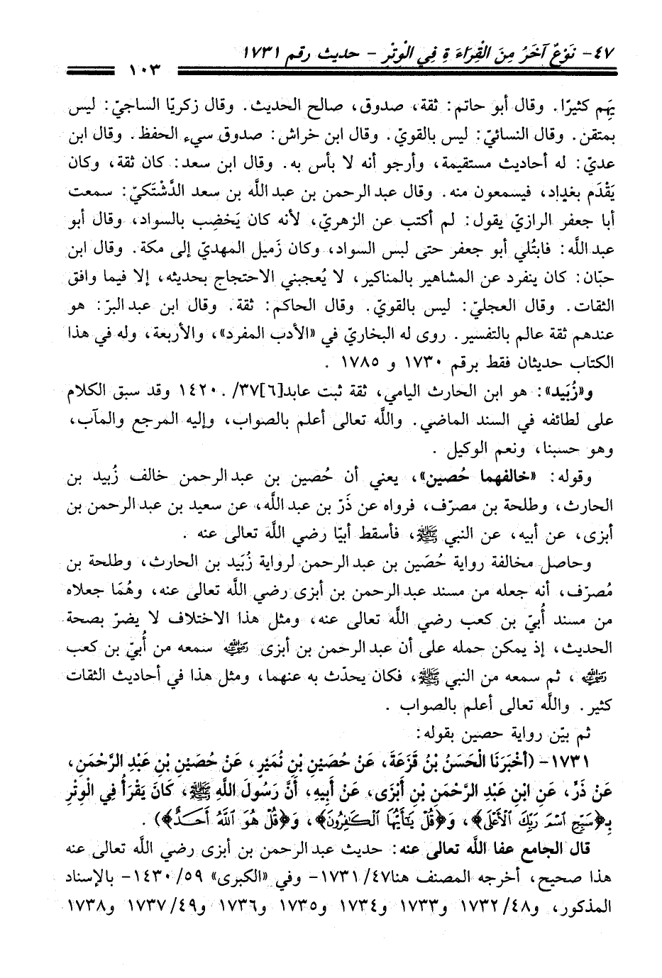 قال- الجامع - عفا اللَّه تعالى عنه -: حديث عبد الرحمن بن أبزى - رضي اللَّه تعالى عنه - هذا صحيح، أخرجه المصنف هنا 47/ 1731 - وفي "الكبرى" 59/ 1430 - بالإسناد المذكور، و 48/ 1732 و 1733 و 1734 و 1735 و 1736 و 49/ 1737 و 1738