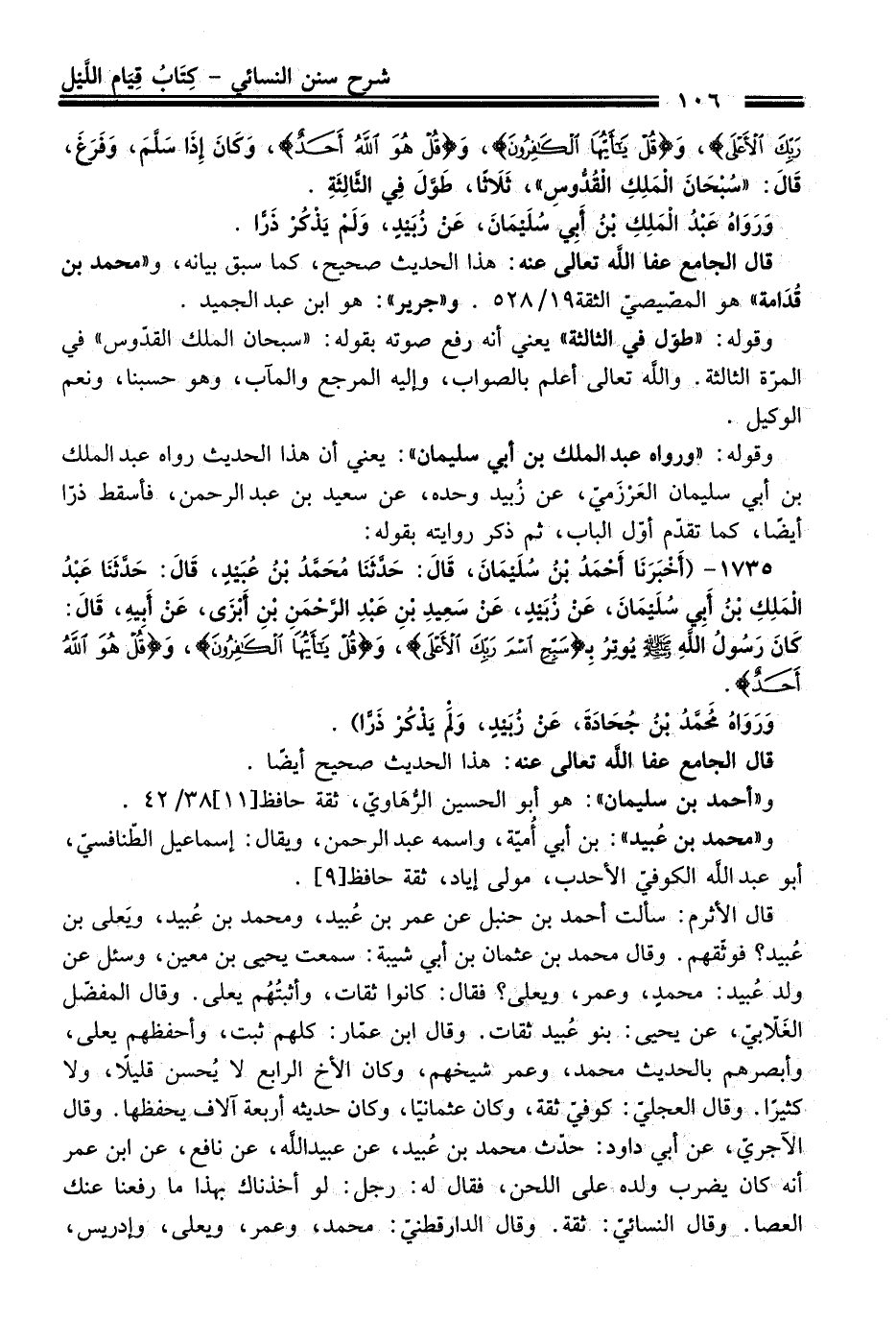 1735 - (أَخْبَرَنَا أَحْمَدُ بْنُ سُلَيْمَانَ, قَالَ: حَدَّثَنَا مُحَمَّدُ بْنُ عُبَيْدٍ, قَالَ: حَدَّثَنَا عَبْدُ الْمَلِكِ بْنُ أَبِي سُلَيْمَانَ, عَنْ زُبَيْدٍ, عَنْ سَعِيدِ بْنِ عَبْدِ الرَّحْمَنِ بْنِ أَبْزَى, عَنْ أَبِيهِ, قَالَ: كَانَ رَسُولُ اللَّهِ - صلى اللَّه عليه وسلم - يُوتِرُ بِـ {سَبِّحِ اسْمَ رَبِّكَ الأَعْلَى} , وَ {قُلْ يَا أَيُّهَا الْكَافِرُونَ} , وَ {قُلْ هُوَ اللَّهُ أَحَدٌ}
