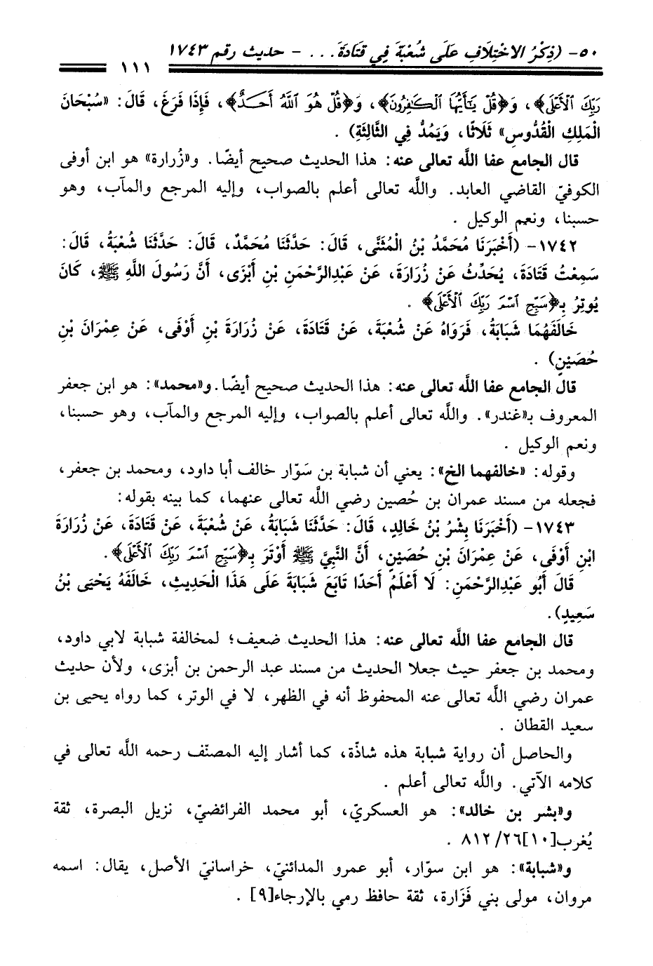 1743 - (أَخْبَرَنَا بِشْرُ بْنُ خَالِدٍ, قَالَ: حَدَّثَنَا شَبَابَةُ, عَنْ شُعْبَةَ, عَنْ قَتَادَةَ, عَنْ زُرَارَةَ بْنِ أَوْفَى, عَنْ عِمْرَانَ بْنِ حُصَيْنٍ, أَنَّ النَّبِيَّ - صلى اللَّه عليه وسلم - أَوْتَرَ بِـ {سَبِّحِ اسْمَ رَبِّكَ الأَعْلَى}.