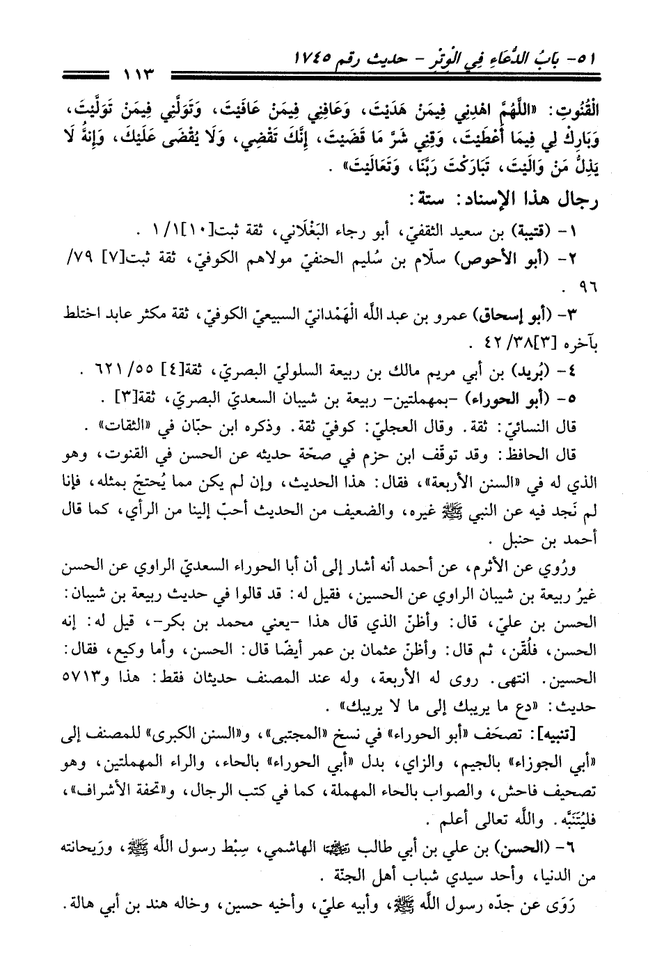 [تنبيه]: تصحَف "أبو الحوراء" في نسخ "المجتبى"، و"السنن الكبرى" للمصنف إلى "أبي الجوزاء" بالجيم، والزاي، بدل "أبي الحوراء" بالحاء، والراء المهملتين، وهو تصحيف فاحش، والصواب بالحاء المهملة، كما في كتب الرجال، و"تحفة الأشراف"، فليُتَنَبَّه. واللَّه تعالى أعلم.