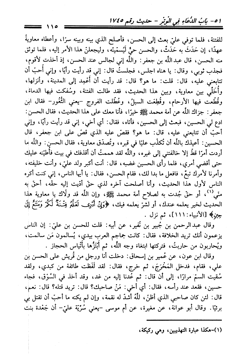 وقال عبدالرحمن بن جُبير بن نُفير، عن أبيه: قلت للحسن بن عليّ: إن الناس يزعمون أنك تريد الخلافة، فقال: كانت جماجم العرب بيدي، يُسالمون مَن سالمت، وُيحاربون من حاربتُ، فتركتها ابتغاءَ وجه اللَّه، ثم أَبْتَزُّها بأَتْياس الحجاز.