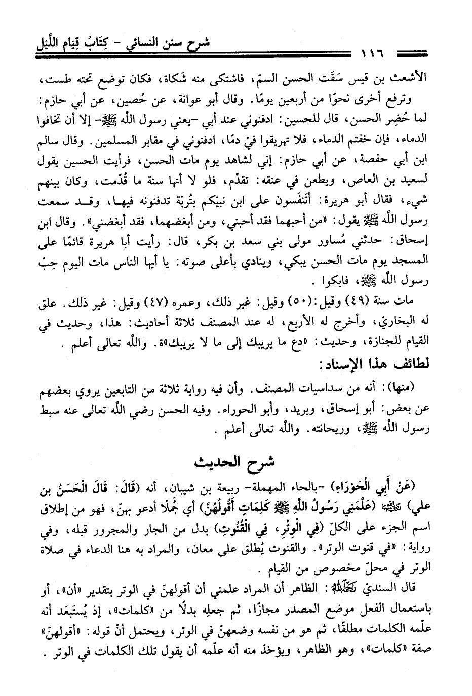 (منها): أنه من سداسيات المصنف. وأن فيه رواية ثلاثة من التابعين يروي بعضهم عن بعض: أبو إسحاق، وبريد، وأبو الحوراء. وفيه الحسن - رضي اللَّه تعالى عنه - سبط رسول اللَّه - صلى اللَّه عليه وسلم -، وريحانته. واللَّه تعالى أعلم.