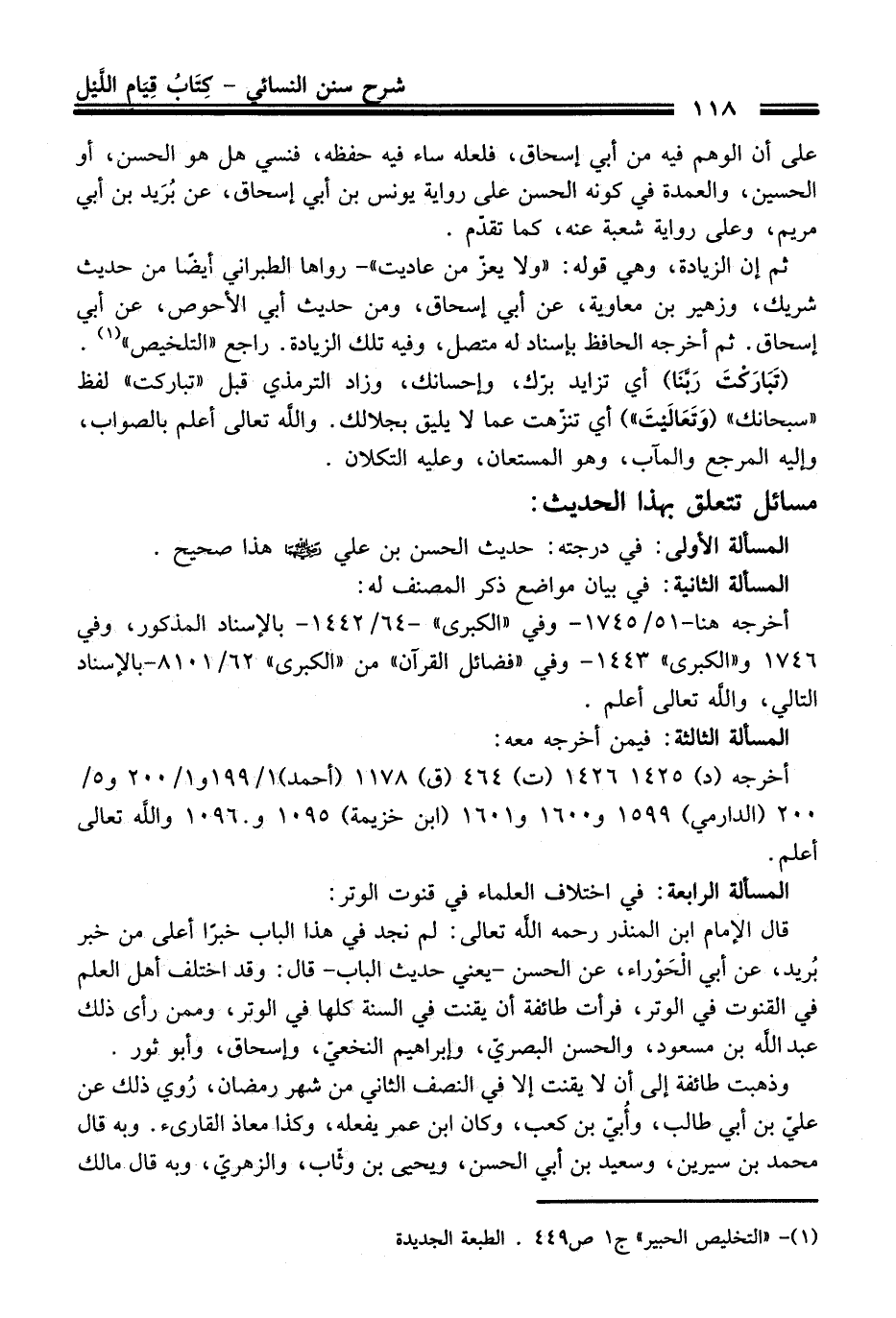 قال الإمام ابن المنذر -رحمه اللَّه تعالى-: لم نجد في هذا الباب خبرًا أعلى من خبر بُريد، عن أبي الْحَوْراء، عن الحسن -يعني حديث الباب- قال: وقد اختلف أهل العلم في القنوت في الوتر، فرأت طائفة أن يقنت في السنة كلها في الوتر، وممن رأى ذلك عبد اللَّه بن مسعود، والحسن البصريّ، وإبراهيم النخعيّ، وإسحاق، وأبو ثور.