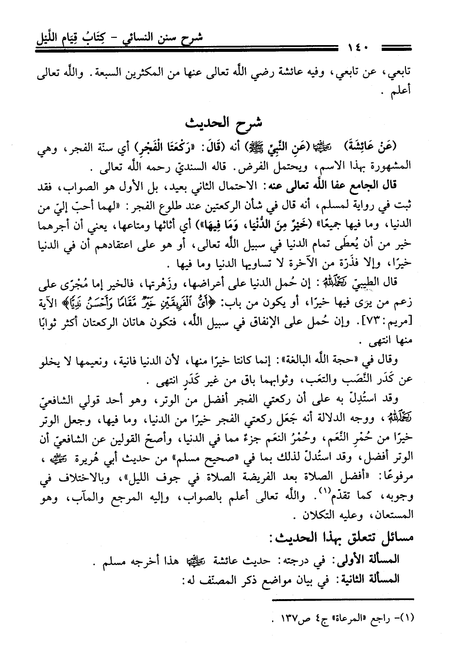 وقد استُدِلّ به على أن ركعتي الفجر أفضل من الوتر، وهو أحد قولي الشافعيّ -رَحِمَهُ اللَّهُ-، ووجه الدلالة أنه جَعَل ركعتي الفجر خيرًا من الدنيا، وما فيها، وجعل الوتر خيرا من حُمْرِ النَّعَم، وحُمرُ النعَم جزءٌ مما في الدنيا، وأصحّ القولين عن الشافعيّ أن الوتر أفضل، وقد استُدلّ لذلك بما في "صحيح مسلم" من حديث أبي هُريرة - رضي اللَّه عنه -، مرفوعًا: "أفضل الصلاة بعد الفريضة الصلاة في جوف الليل"، وبالاختلاف في وجوبه، كما تقدّم (¬1). واللَّه تعالى أعلم بالصواب، وإليه المرجع والمآب، وهو المستعان، وعليه التكلان.