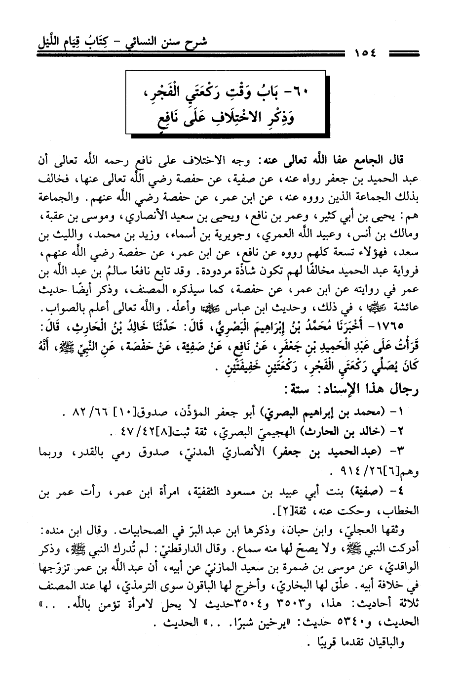 قال الجامع - عفا اللَّه تعالى عنه -: وجه الاختلاف على نافع -رحمه اللَّه تعالى- أن عبد الحميد بن جعفر رواه عنه، عن صفيه، عن حفصه - رضي اللَّه تعالى عنها - فخالف بذلك الجماعة الذين رووه عنه، عن ابن عمر، عن حفصة رضي اللَّه عنهم. والجماعة هم: يحيى بن أبي كثير، وعمر بن نافع، ويحيى بن سعيد الأنصاري، وموسى بن عقبة، ومالك بن أنس، وعبيد اللَّه العمري، وجويرية بن أسماء، وزيد بن محمد، والليث بن سعد، فهؤلاء تسعة كلهم رووه عن نافع، عن ابن عمر، عن حفصة - رضي اللَّه عنهم -، فرواية عبد الحميد مخالفًا لهم تكون شاذّة مردودة، وقد تابع نافعًا سالمُ بن عبد اللَّه بن عمر في روايته عن ابن عمر، عن حفصة، كما سيذكره المصنف، وذكر أيضًا حديث عائشة - رضي اللَّه عنها - في ذلك، وحديث ابن عباس - رضي اللَّه عنهما - وأعلّه. واللَّه تعالى أعلم بالصواب.