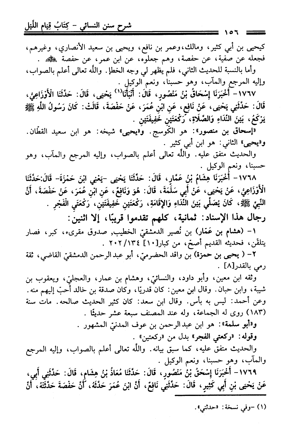 1768 - أَخْبَرَنَا هِشَامُ بْنُ عَمَّارٍ, قَالَ: حَدَّثَنَا يَحْيَى -يَعْنِي ابْنَ حَمْزَةَ- قَالَ: حَدَّثَنَا الأَوْزَاعِيُّ, عَنْ يَحْيَى, عَنْ أَبِي سَلَمَةَ, قَالَ: هُوَ وَنَافِعٌ, عَنِ ابْنِ عُمَرَ, عَنْ حَفْصَةَ, أَنَّ النَّبِيَّ - صلى اللَّه عليه وسلم -, كَانَ يُصَلِّي بَيْنَ النِّدَاءِ وَالإِقَامَةِ, رَكْعَتَيْنِ خَفِيفَتَيْنِ, رَكْعَتَىِ الْفَجْرِ.