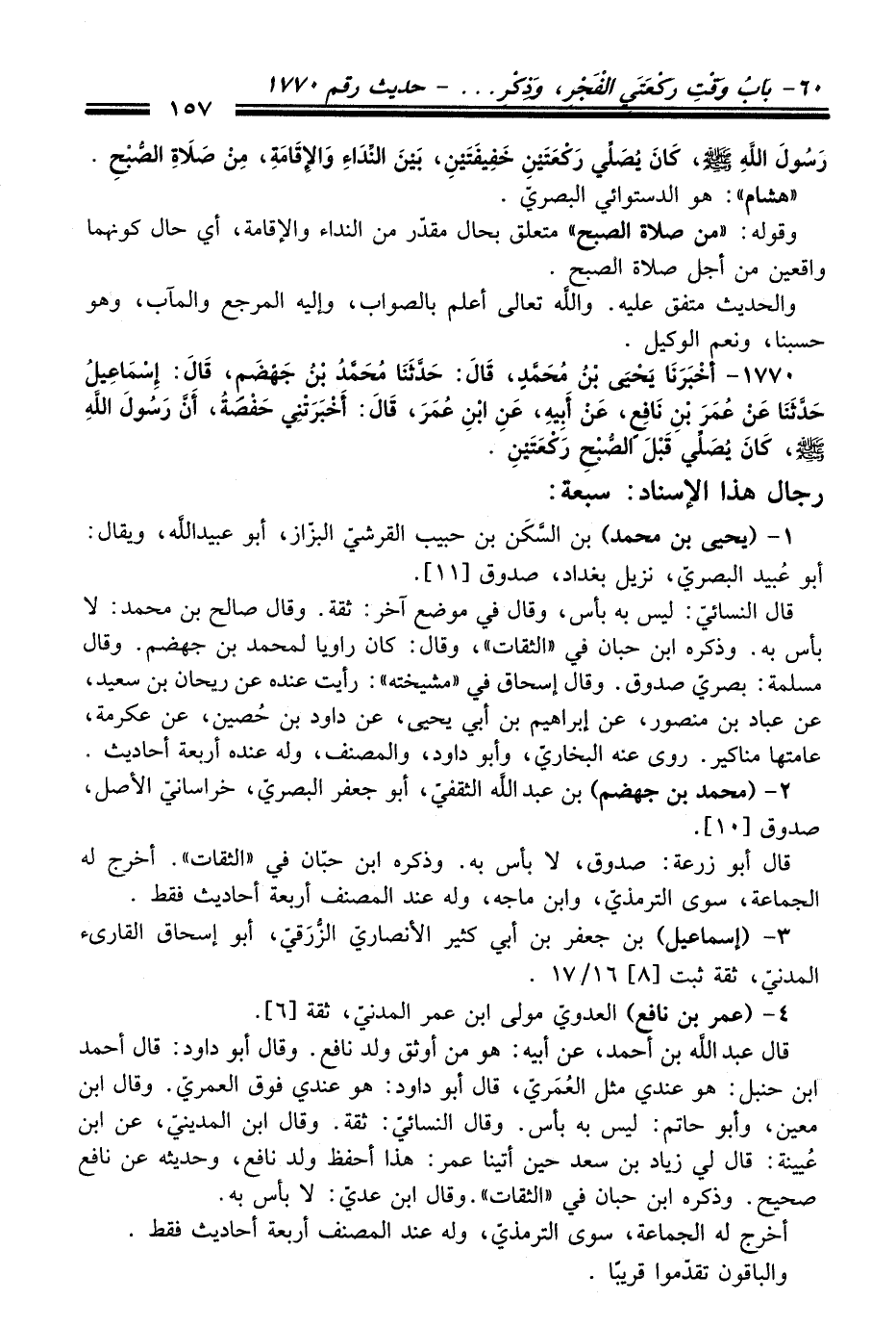 1770 - أَخْبَرَنَا يَحْيَى بْنُ مُحَمَّدٍ, قَالَ: حَدَّثَنَا مُحَمَّدُ بْنُ جَهْضَمٍ, قَالَ: إِسْمَاعِيلُ حَدَّثَنَا عَنْ عُمَرَ بْنِ نَافِعٍ, عَنْ أَبِيهِ, عَنِ ابْنِ عُمَرَ, قَالَ: أَخْبَرَتْنِي حَفْصَةُ, أَنَّ رَسُولَ اللَّهِ - صلى اللَّه عليه وسلم -, كَانَ يُصَلِّي قَبْلَ الصُّبْحِ رَكْعَتَيْنِ.