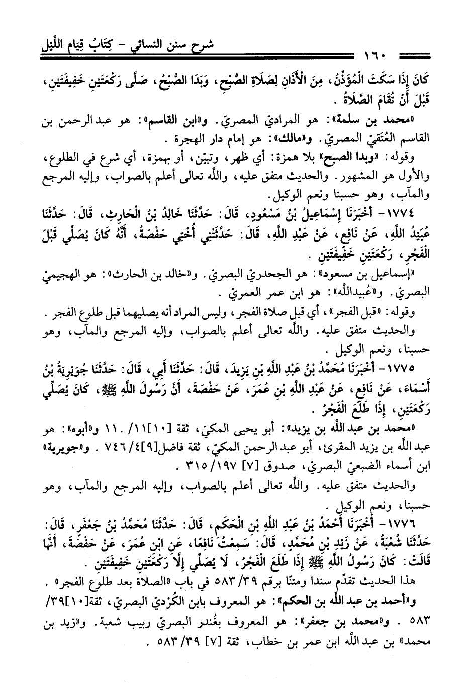 1776 - أَخْبَرَنَا أَحْمَدُ بْنُ عَبْدِ اللَّهِ بْنِ الْحَكَمِ, قَالَ: حَدَّثَنَا مُحَمَّدُ بْنُ جَعْفَرٍ, قَالَ: حَدَّثَنَا شُعْبَةُ, عَنْ زَيْدِ بْنِ مُحَمَّدٍ, قَالَ: سَمِعْتُ نَافِعًا, عَنِ ابْنِ عُمَرَ, عَنْ حَفْصَةَ, أَنَّهَا قَالَتْ: كَانَ رَسُولُ اللَّهِ - صلى اللَّه عليه وسلم - إِذَا طَلَعَ الْفَجْرُ, لاَ يُصَلِّي إِلاَّ رَكْعَتَيْنِ خَفِيفَتَيْنِ.