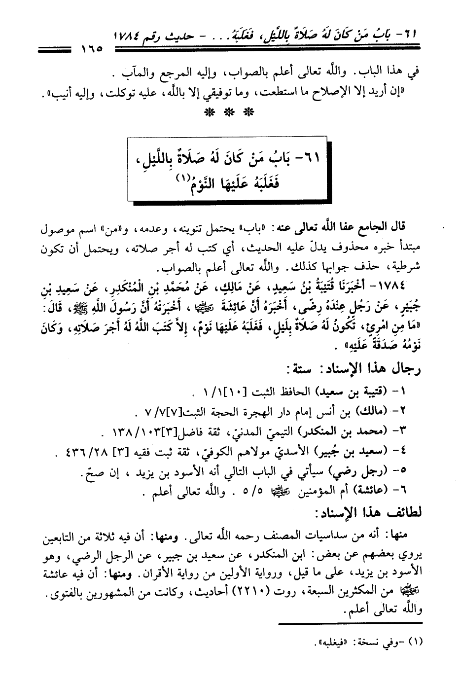 1784 - أَخْبَرَنَا قُتَيْبَةُ بْنُ سَعِيدٍ, عَنْ مَالِكٍ, عَنْ مُحَمَّدِ بْنِ الْمُنْكَدِرِ, عَنْ سَعِيدِ بْنِ جُبَيْرٍ, عَنْ رَجُلٍ عِنْدَهُ رِضًى, أَخْبَرَهُ أَنَّ عَائِشَةَ - رضي اللَّه عنها -, أَخْبَرَتْهُ أَنَّ رَسُولَ اللَّهِ - صلى اللَّه عليه وسلم -, قَالَ: «مَا مِنِ امْرِئٍ تَكُونُ لَهُ صَلاَةٌ بِلَيْلٍ, فَغَلَبَهُ عَلَيْهَا نَوْمٌ, إِلاَّ كَتَبَ اللَّهُ لَهُ أَجْرَ صَلاَتِهِ, وَكَانَ نَوْمُهُ صَدَقَةً عَلَيْهِ».