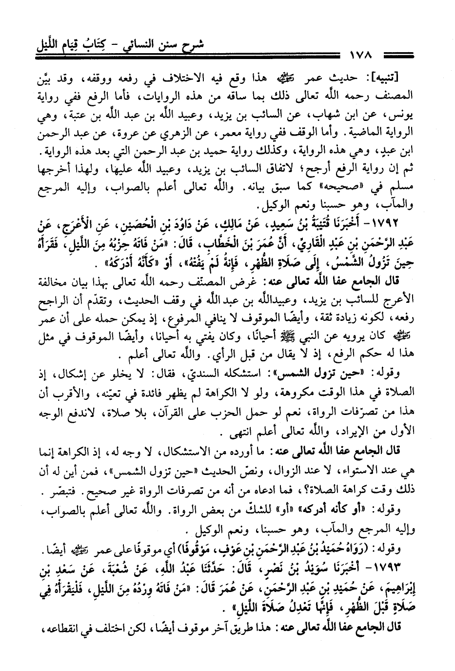 1792 - أَخْبَرَنَا قُتَيْبَةُ بْنُ سَعِيدٍ, عَنْ مَالِكٍ, عَنْ دَاوُدَ بْنِ الْحُصَيْنِ, عَنِ الأَعْرَجِ, عَنْ عَبْدِ الرَّحْمَنِ بْنِ عَبْدٍ الْقَارِيِّ, أَنَّ عُمَرَ بْنَ الْخَطَّابِ, قَالَ: مَنْ فَاتَهُ حِزْبُهُ مِنَ اللَّيْلِ, فَقَرَأَهُ حِينَ تَزُولُ الشَّمْسُ, إِلَى صَلاَةِ الظُّهْرِ, فَإِنَّهُ لَمْ يَفُتْهُ", أَوْ "كَأَنَّهُ أَدْرَكَهُ".