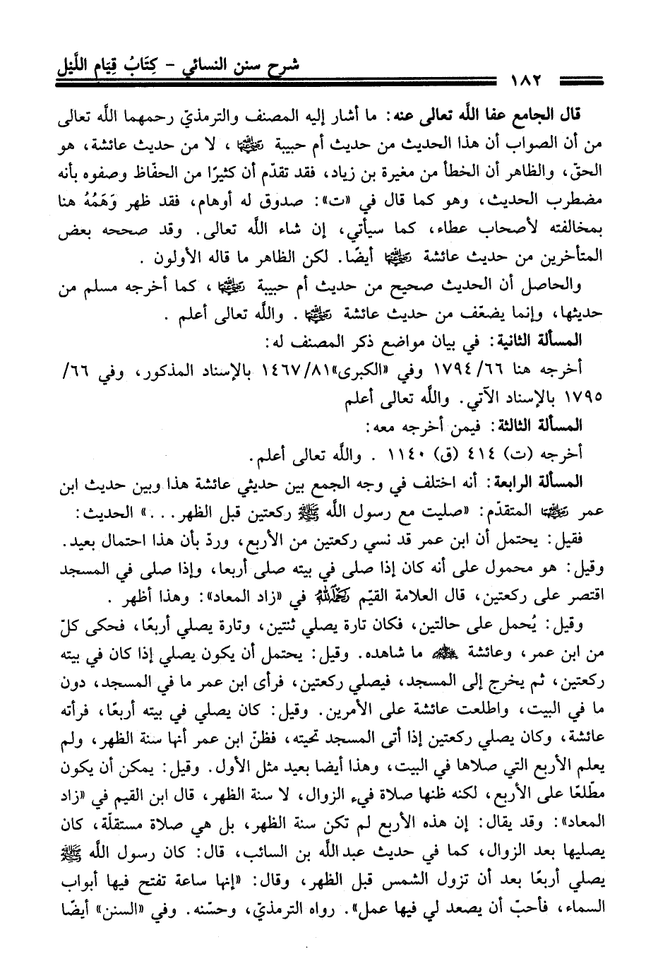 وقيل: يُحمل على حالتين، فكان تارة يصلي ثنتين، وتارة يصلي أربعًا، فحكى كلّ من ابن عمر، وعائشة - رضي اللَّه عنها - ما شاهده. وقيل: يحتمل أن يكون يصلي إذا كان في بيته ركعتين، ثم يخرج إلى المسجد، فيصلي ركعتين، فرأى ابن عمر ما في المسجد، دون ما في البيت، واطلعت عائشة على الأمرين. وقيل: كان يصلي في بيته أربعًا، فرأته عائشة، وكان يصلي ركعتين إذا أتى المسجد تحيته، فظنّ ابن عمر أنها سنة الظهر، ولم يعلم الأربع التي صلاها في البيت، وهذا أيضا بعيد مثل الأول. وقيل: يمكن أن يكون مطّلعًا على الأربع، لكنه ظنها صلاة فيء الزوال، لا سنة الظهر، قال ابن القيم في "زاد المعاد": وقد يقال: إن هذه الأربع لم تكن سنة الظهر، بل هي صلاة مستقلّة، كان يصليها بعد الزوال، كما في حديث عبد اللَّه بن السائب، قال: كان رسول اللَّه - صلى اللَّه عليه وسلم - يصلي أربعًا بعد أن تزول الشمس قبل الظهر، وقال: "إنها ساعة تفتح فيها أبواب السماء، فأحبّ أن يصعد لي فيها عمل". رواه الترمذيّ، وحسّنه. وفي "السنن" أيضًا