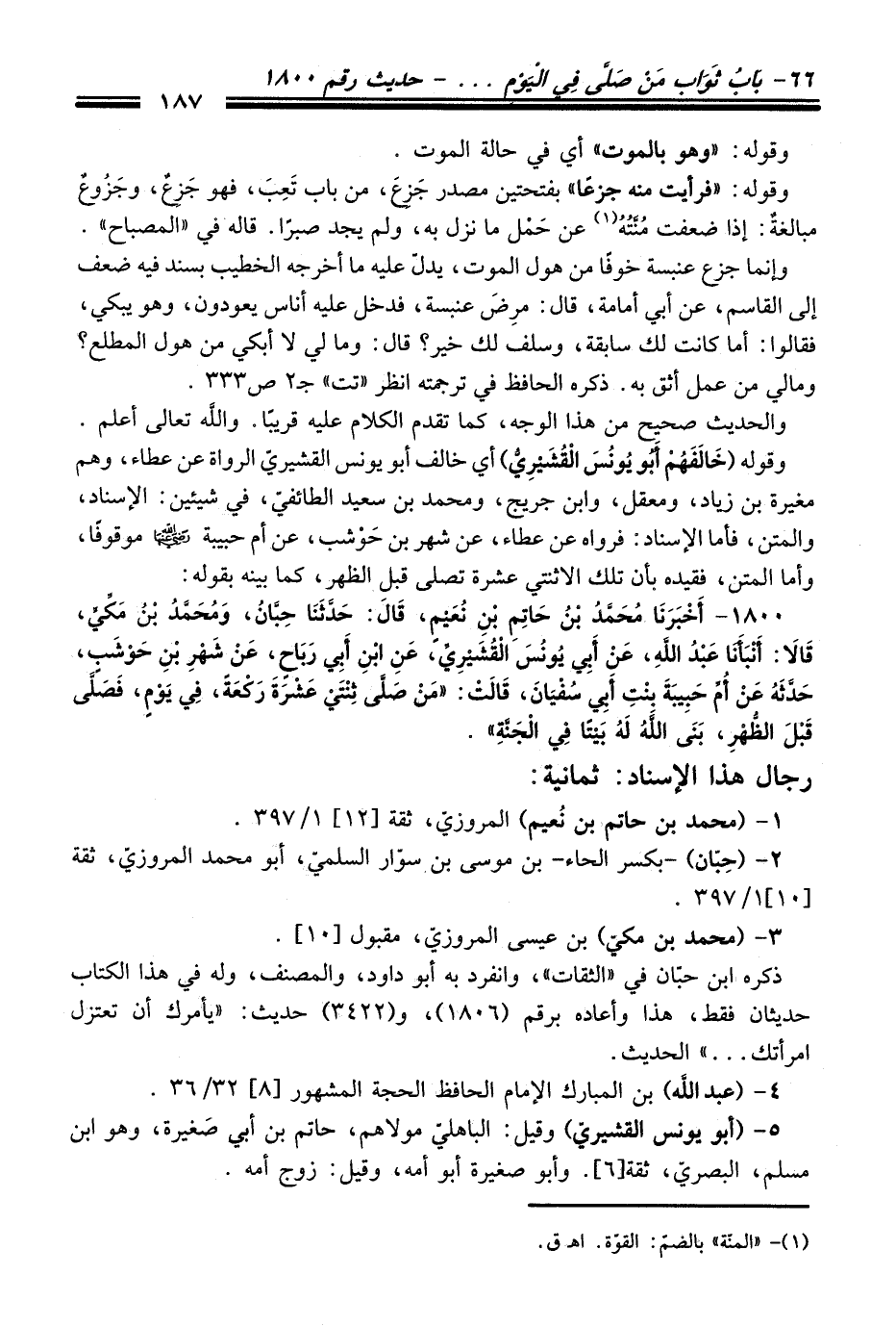1800 - أَخْبَرَنَا مُحَمَّدُ بْنُ حَاتِمِ بْنِ نُعَيْمٍ, قَالَ: حَدَّثَنَا حَبَّانُ, وَمُحَمَّدُ بْنُ مَكِّيٍّ, قَالاَ: أَنْبَأَنَا عَبْدُ اللَّهِ, عَنْ أَبِي يُونُسَ الْقُشَيْرِيِّ, عَنِ ابْنِ أَبِي رَبَاحٍ, عَنْ شَهْرِ بْنِ حَوْشَبٍ, حَدَّثَهُ عَنْ أُمِّ حَبِيبَةَ بِنْتِ أَبِي سُفْيَانَ, قَالَتْ: "مَنْ صَلَّى ثِنْتَيْ عَشْرَةَ رَكْعَةً, فِي يَوْمٍ, فَصَلَّى قَبْلَ الظُّهْرِ, بَنَى اللَّهُ لَهُ بَيْتًا فِي الْجَنَّةِ".