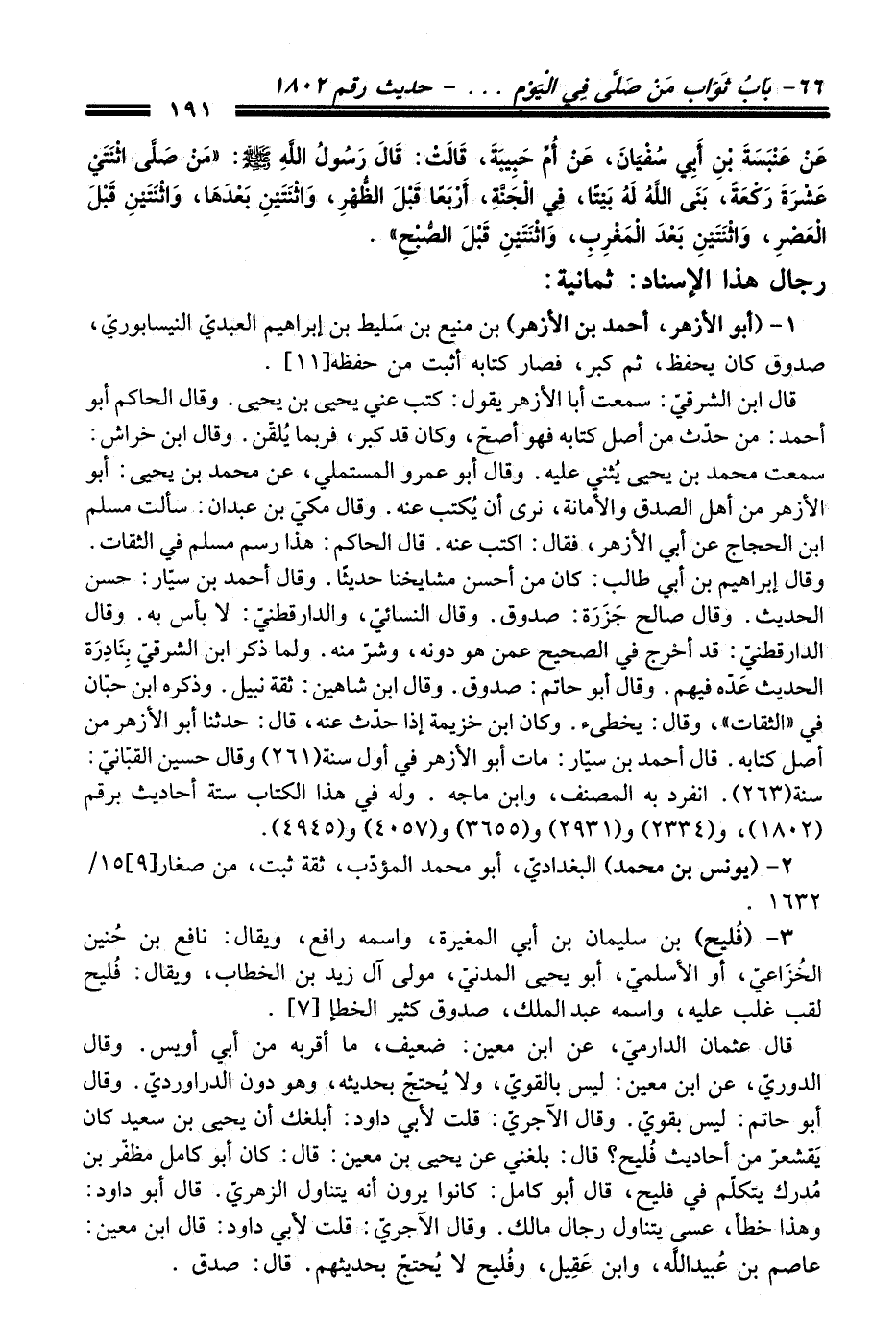 عَنْ عَنْبَسَةَ بْنِ أَبِي سُفْيَانَ, عَنْ أُمِّ حَبِيبَةَ, قَالَتْ: قَالَ رَسُولُ اللَّهِ - صلى اللَّه عليه وسلم -: «مَنْ صَلَّى اثْنَتَيْ عَشْرَةَ رَكْعَةً, بَنَى اللَّهُ لَهُ بَيْتًا, فِي الْجَنَّةِ أَرْبَعًا قَبْلَ الظُّهْرِ, وَاثْنَتَيْنِ بَعْدَهَا, وَاثْنَتَيْنِ قَبْلَ الْعَصْرِ, وَاثْنَتَيْنِ بَعْدَ الْمَغْرِبِ, وَاثْنَتَيْنِ قَبْلَ الصُّبْحِ».