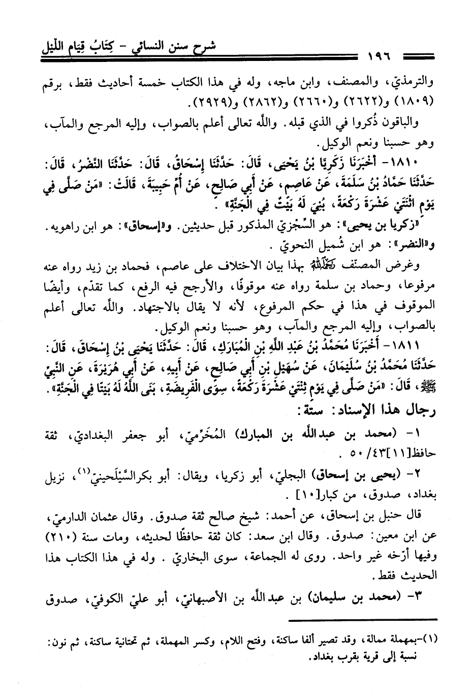 "زكريا بن يحيى": هو السِّجْزيّ المذكور قبل حديثين. و "إسحاق": هو ابن راهويه. و"النضر": هو ابن شُميل النحويّ.