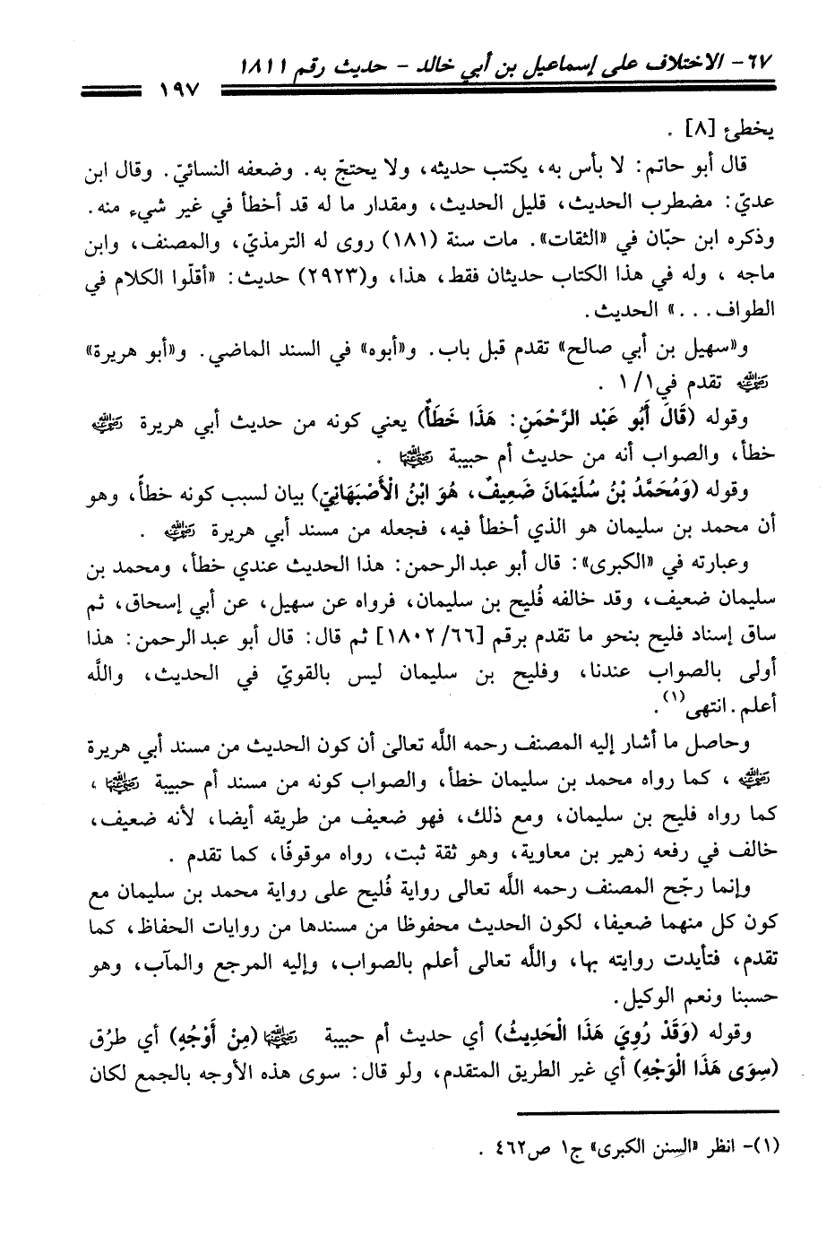 وقوله (وَمُحَمَّدُ بْنُ سُلَيْمَانَ ضَعِيفٌ، هُوَ ابْنُ الْأَصْبَهَانِيّ) بيان لسبب كونه خطأً، وهو أن محمد بن سليمان هو الذي أخطأ فيه، فجعله من مسند أبي هريرة - رضي اللَّه عنه -.
