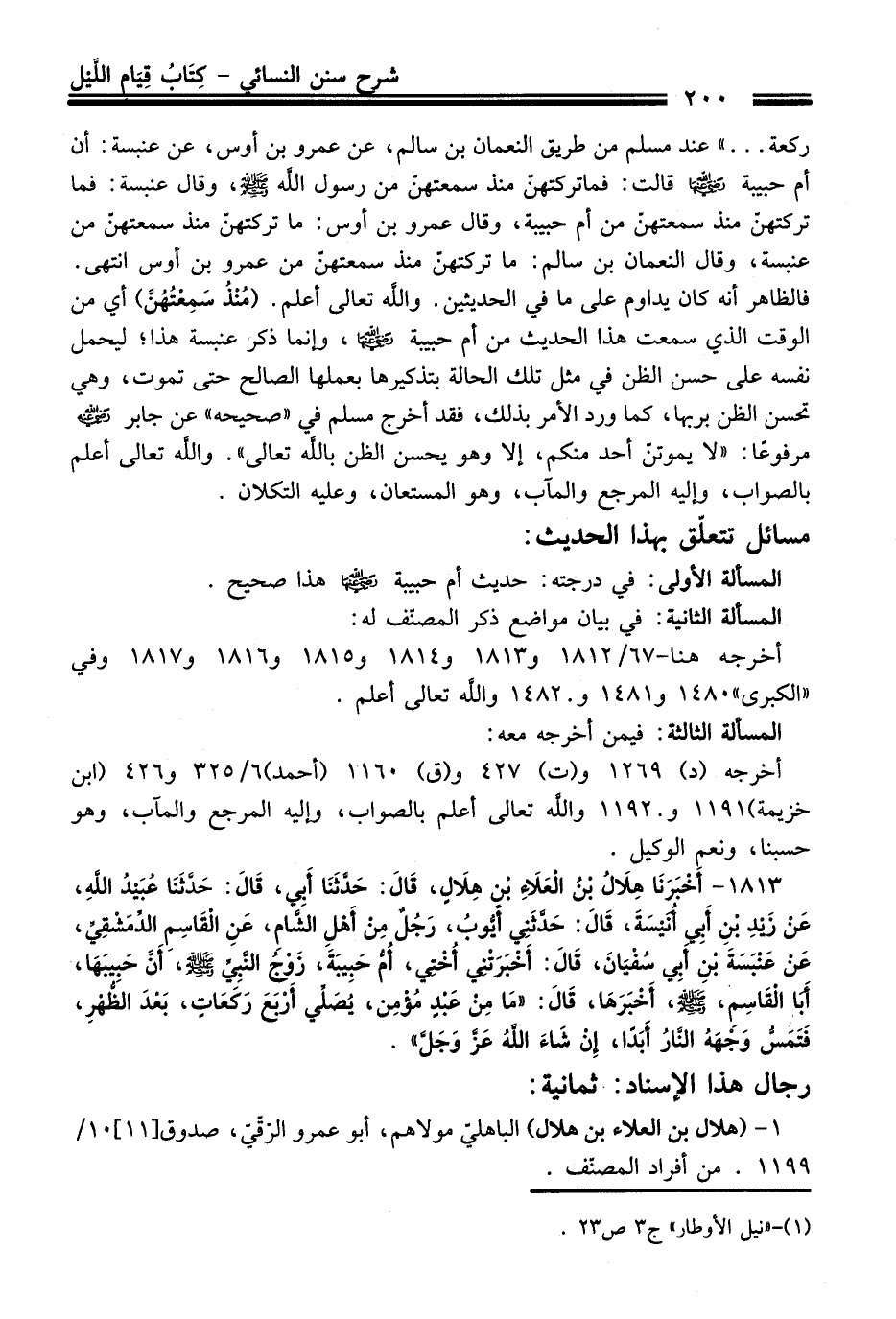 ركعة ... " عند مسلم من طريق النعمان بن سالم، عن عمرو بن أوس، عن عنبسة: أن أم حبيبة - رضي اللَّه عنها - قالت: فما تركتهنّ منذ سمعتهنّ من رسول اللَّه - صلى اللَّه عليه وسلم -، وقال عنبسة: فما تركتهنّ منذ سمعتهنّ من أم حبيبة، وقال عمرو بن أوس: ما تركتهنّ منذ سمعتهنّ من عنبسة، وقال النعمان بن سالم: ما تركتهنّ منذ سمعتهنّ من عمرو بن أوس انتهى.