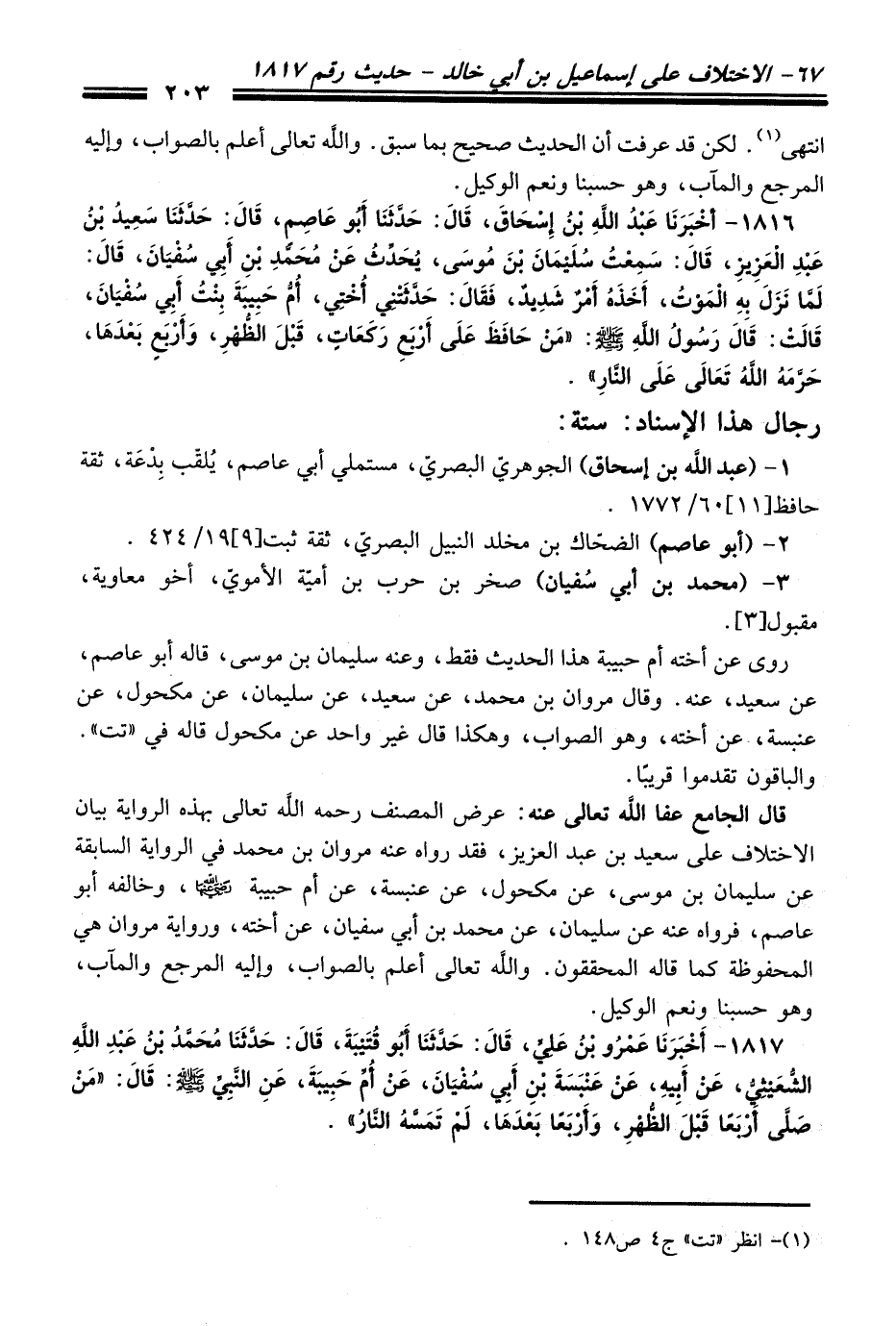 1817 - أَخْبَرَنَا عَمْرُو بْنُ عَلِيٍّ, قَالَ: حَدَّثَنَا أَبُو قُتَيْبَةَ, قَالَ: حَدَّثَنَا مُحَمَّدُ بْنُ عَبْدِ اللَّهِ الشُّعَيْثِيُّ, عَنْ أَبِيهِ, عَنْ عَنْبَسَةَ بْنِ أَبِي سُفْيَانَ, عَنْ أُمِّ حَبِيبَةَ, عَنِ النَّبِيِّ - صلى اللَّه عليه وسلم -: قَالَ: «مَنْ صَلَّى أَرْبَعًا قَبْلَ الظُّهْرِ, وَأَرْبَعًا بَعْدَهَا, لَمْ تَمَسَّهُ النَّارُ».
