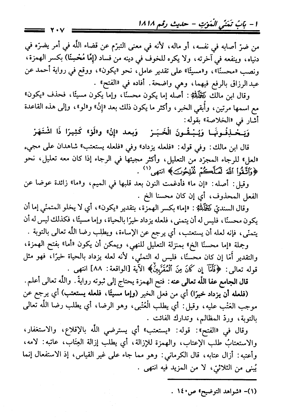 وقال السنديّ -رَحِمَهُ اللَّهُ-: "إما" بكسر الهمزة، بتقدير "يكون"، أي لا يخلو المتمنّي إما أن يكون محسنًا، فليس له أن يتمنى، فلعله يزداد خيرًا بالحياة، وإما مسيئًا، فكذلك ليس له أن يتمنى، فإنه لعله أن يستعتب، أي يرجع عن الإساءة، ويطلب رضا اللَّه تعالى بالتوبة.