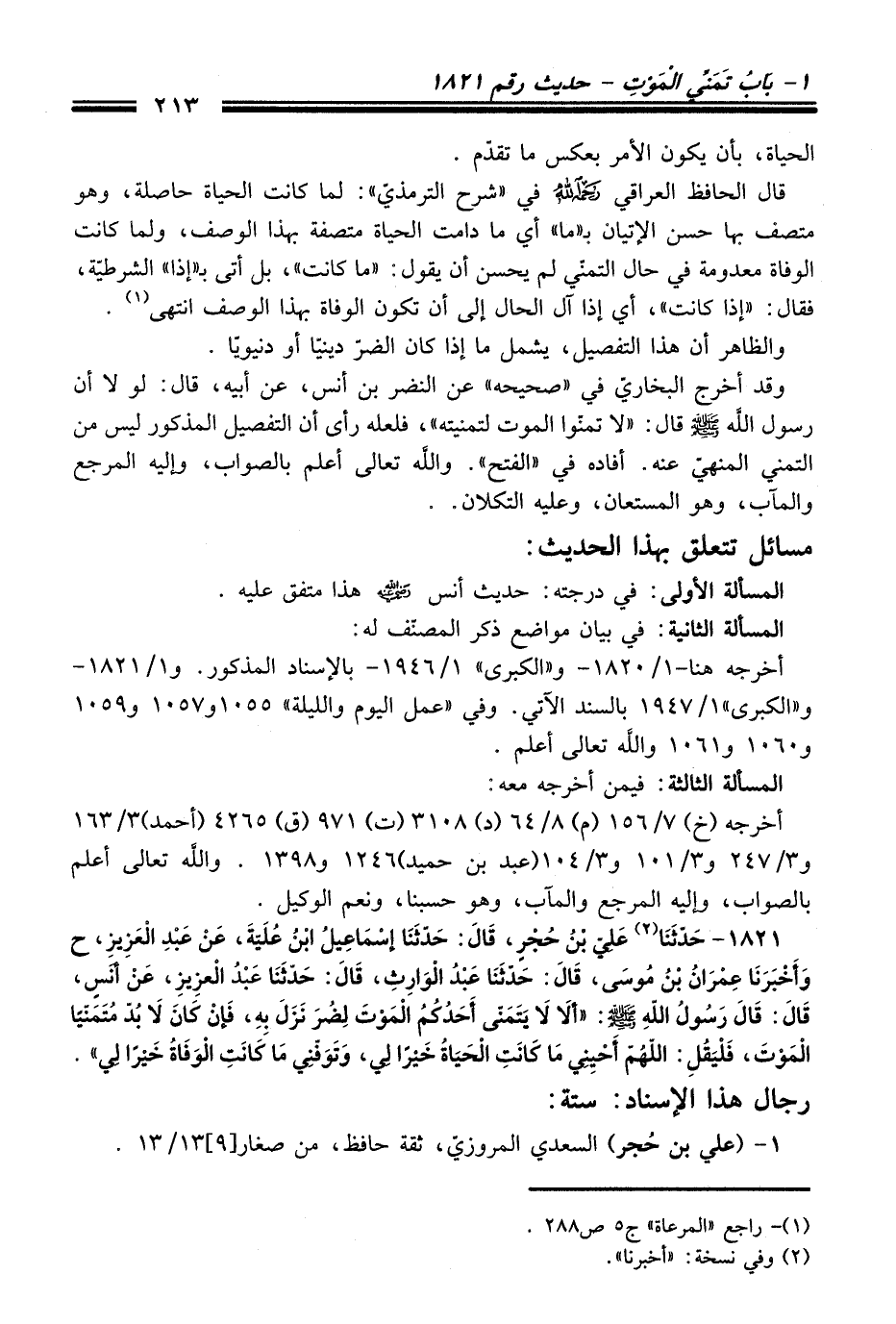 1821 - حَدّثَنَا (¬2) عَلِيُّ بْنُ حُجْرٍ, قَالَ: حَدَّثَنَا إِسْمَاعِيلُ ابْنُ عُلَيَّةَ, عَنْ عَبْدِ الْعَزِيزِ, ح وَأَخْبَرَنَا عِمْرَانُ بْنُ مُوسَى, قَالَ: حَدَّثَنَا عَبْدُ الْوَارِثِ, قَالَ: حَدَّثَنَا عَبْدُ الْعَزِيزِ, عَنْ أَنَسٍ, قَالَ: قَالَ رَسُولُ اللَّهِ - صلى اللَّه عليه وسلم -: «أَلاَ لاَ يَتَمَنَّى أَحَدُكُمُ الْمَوْتَ لِضُرٍّ نَزَلَ بِهِ, فَإِنْ كَانَ لاَ بُدَّ مُتَمَنِّيًا الْمَوْتَ, فَلْيَقُلِ: اللَّهُمَّ أَحْيِنِي مَا كَانَتِ الْحَيَاةُ خَيْرًا لِي, وَتَوَفَّنِي إِذَا كَانَتِ الْوَفَاةُ خَيْرًا لِي».