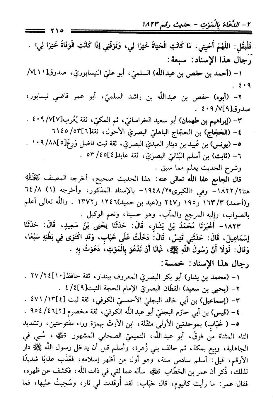 1823 - أَخْبَرَنَا مُحَمَّدُ بْنُ بَشَّارٍ, قَالَ: حَدَّثَنَا يَحْيَى بْنُ سَعِيدٍ, قَالَ: حَدَّثَنَا إِسْمَاعِيلُ, قَالَ: حَدَّثَنِي قَيْسٌ, قَالَ: دَخَلْتُ عَلَى خَبَّابٍ, وَقَدِ اكْتَوَى فِي بَطْنِهِ سَبْعًا, وَقَالَ: لَوْلاَ أَنَّ رَسُولَ اللَّهِ - صلى اللَّه عليه وسلم -, نَهَانَا أَنْ نَدْعُوَ بِالْمَوْتِ, دَعَوْتُ بِهِ.