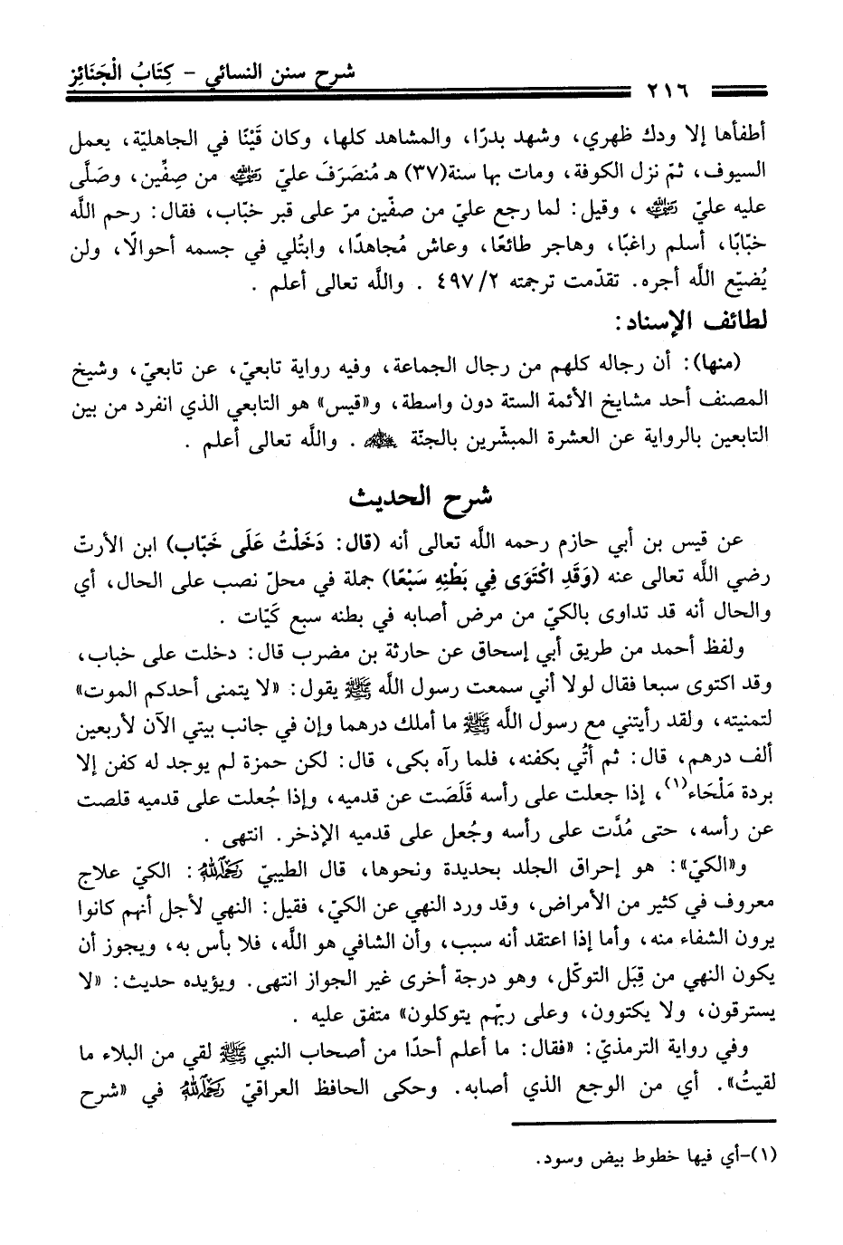 ولفظ أحمد من طريق أبي إسحاق عن حارثة بن مضرب قال: دخلت على خباب، وقد اكتوى سبعا فقال لولا أني سمعت رسول اللَّه - صلى اللَّه عليه وسلم - يقول: "لا يتمنى أحدكم الموت" لتمنيته، ولقد رأيتني مع رسول اللَّه - صلى اللَّه عليه وسلم - ما أملك درهما وإن في جانب بيتي الآن لأربعين ألف درهم، قال: ثم أتُي بكفنه، فلما رآه بكى، قال: لكن حمزة لم يوجد له كفن إلا بردة مَلْحَاء (¬1)، إذا جعلت على رأسه قَلَصَت عن قدميه، وإذا جُعلت على قدميه قلصت عن رأسه، حتى مُدَّت على رأسه وجُعل على قدميه الإذخر. انتهى.