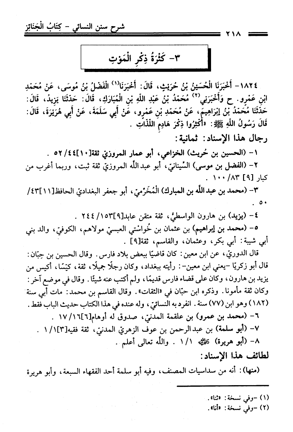 1824 - أَخْبَرَنَا الْحُسَيْنُ بْنُ حُرَيْثٍ, قَالَ: أَخْبَرَنَا (¬1) الْفَضْلُ بْنُ مُوسَى, عَنْ مُحَمَّدِ بْنِ عَمْرٍو. ح وَأَخْبَرَنِي (¬2) مُحَمَّدُ بْنُ عَبْدِ اللَّهِ بْنِ الْمُبَارَكِ, قَالَ: حَدَّثَنَا يَزِيدُ, قَالَ: أَنْبَأَنَا مُحَمَّدُ بْنُ إِبْرَاهِيمَ, عَنْ مُحَمَّدِ بْنِ عَمْرٍو, عَنْ أَبِي سَلَمَةَ, عَنْ أَبِي هُرَيْرَةَ, قَالَ: قَالَ: رَسُولُ اللَّهِ - صلى اللَّه عليه وسلم -: «أَكْثِرُوا ذِكْرَ هَاذِمِ اللَّذَّاتِ».