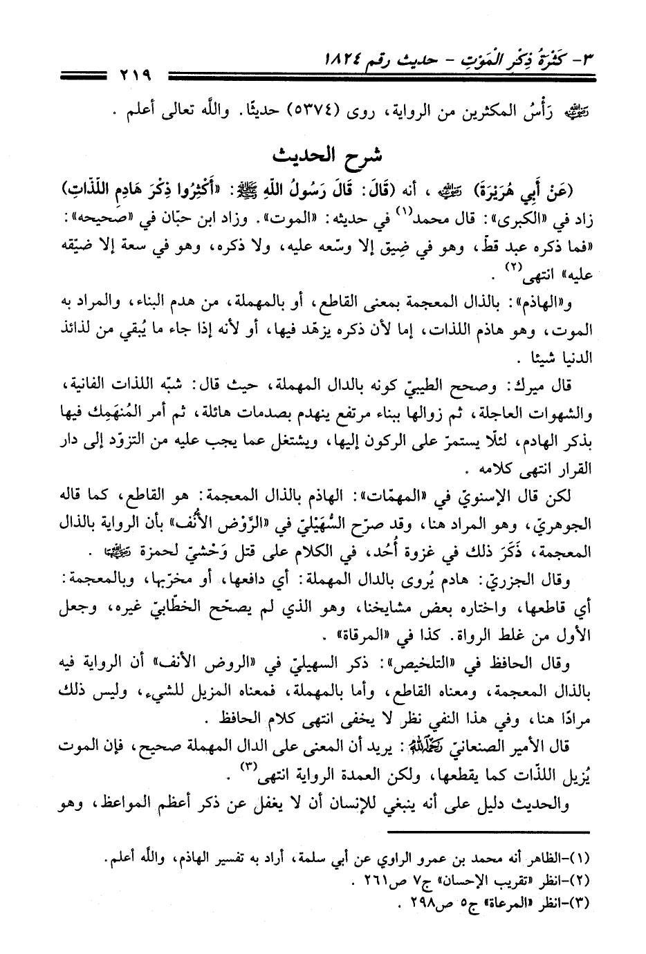 (عَنْ أَبِي هُرَيْرَةَ) - رضي اللَّه عنه -، أنه (قَالَ: قَالَ رَسُولُ اللَّهِ - صلى اللَّه عليه وسلم -: "أَكْثِرُوا ذِكْرَ هَادِمِ اللّذّاتِ") زاد في "الكبرى": قال محمد (¬1) في حديثه: "الموت". وزاد ابن حبّان في "صحيحه": "فما ذكره عبد قطّ، وهو في ضِيق إلا وسّعه عليه، ولا ذكره، وهو في سعة إلا ضيّقه عليه" انتهى (¬2).