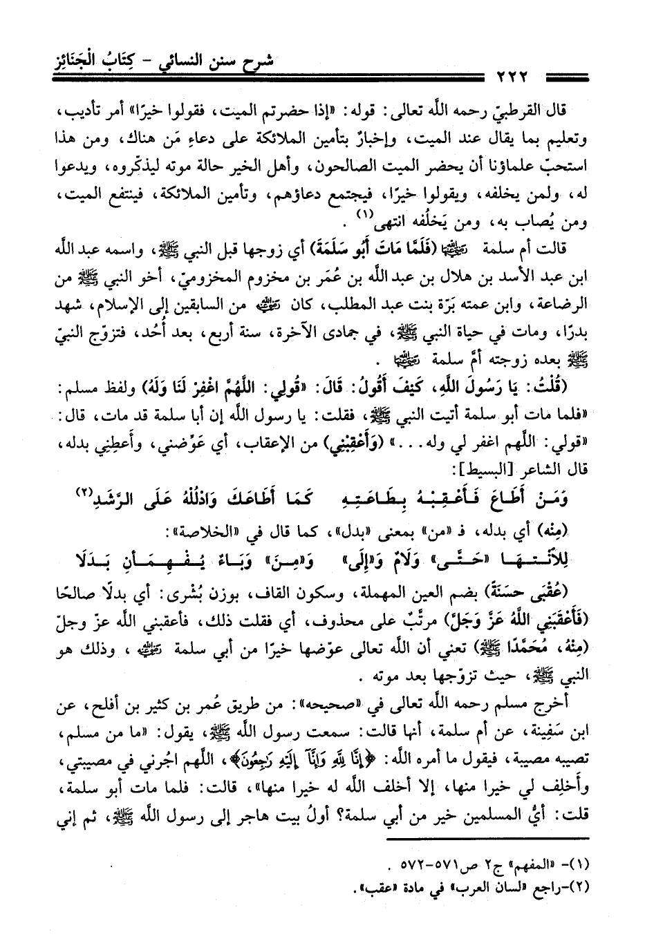 أخرج مسلم -رحمه اللَّه تعالى- في "صحيحه": من طريق عُمر بن كثير بن أفلح، عن ابن سَفِينة، عن أم سلمة، أنها قالت: سمعت رسول اللَّه - صلى اللَّه عليه وسلم -، يقول: "ما من مسلم، تصيبه مصيبة، فيقول ما أمره اللَّه: {إِنَّا لِلَّهِ وَإِنَّا إِلَيْهِ رَاجِعُونَ}، اللهم اجُرني في مصيبتي، وأَخلِف لي خيرا منها، إلا أخلف اللَّه له خيرا منها"، قالت: فلما مات أبو سلمة، قلت: أيُّ المسلمين خير من أبي سلمة؟ أولُ بيت هاجر إلى رسول اللَّه - صلى اللَّه عليه وسلم -، ثم إني