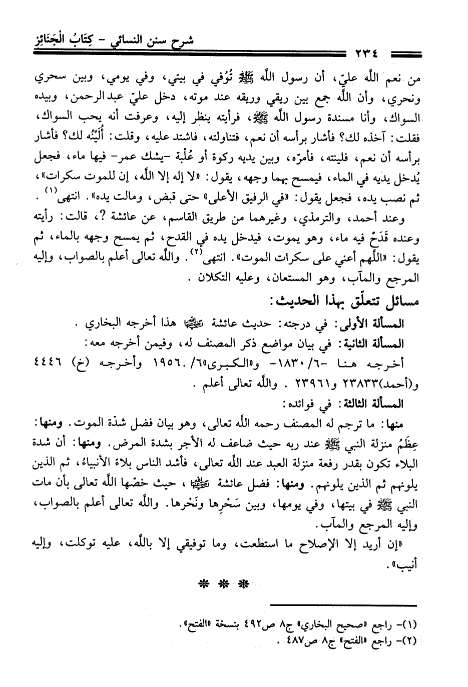 وعند أحمد، والترمذي، وغيرهما من طريق القاسم، عن عائشة؟، قالت: رأيته وعنده قَدَحٌ فيه ماء، وهو يموت، فيدخل يده في القدح، ثم يمسح وجهه بالماء، ثم يقول: "اللَّهم أعني على سكرات الموت". انتهى (¬2). واللَّه تعالى أعلم بالصواب، وإليه المرجع والمآب، وهو المستعان، وعليه التكلان.