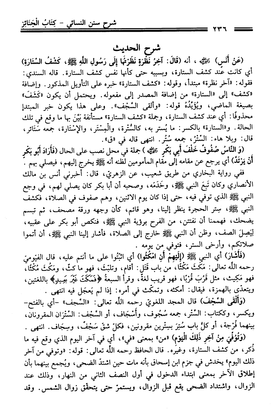 (عَنْ أَنَسٍ) - رضي اللَّه عنه -، أنه (قَالَ: آخِرُ نَظرَةٍ نَظَرْتُهَا إِلَى رَسُولِ اللَّهِ - صلى اللَّه عليه وسلم -، كَشْفُ السِّتَارَةِ) أي كانت عند كشف الستارة، وبسببه حتى كأنها نفس كشف الستارة. قاله السندي: فقوله: "آخر نظرة" مبتدأ، وقوله: "كشف الستارة" خبره على التأويل المذكور. وإضافة "كشف" إلى "الستارة" من إضافة المصدر إلى مفعوله. ويحتمل أن يكون "كَشَفَ" بصيغة الماضي، ويُؤَيِّدُهُ قوله: "وألقى السَّجْف". وعلى هذا يكون خبر المبتدإ محذوفًا: أي عند كشف الستارة، وجملة "كشف الستارة" مستأنفة بَيَّنَ بها ما وقع في تلك الحالة. و"الستارة" بالكسر: ما يُستر به، كالسُّتْرة، والْمِسْتَر، والإسْتَارة، جمعه سَتَائر، قال: وبلا هاء: السِّتْرُ، جمعه سُتُر. انتهى قاله في "ق".