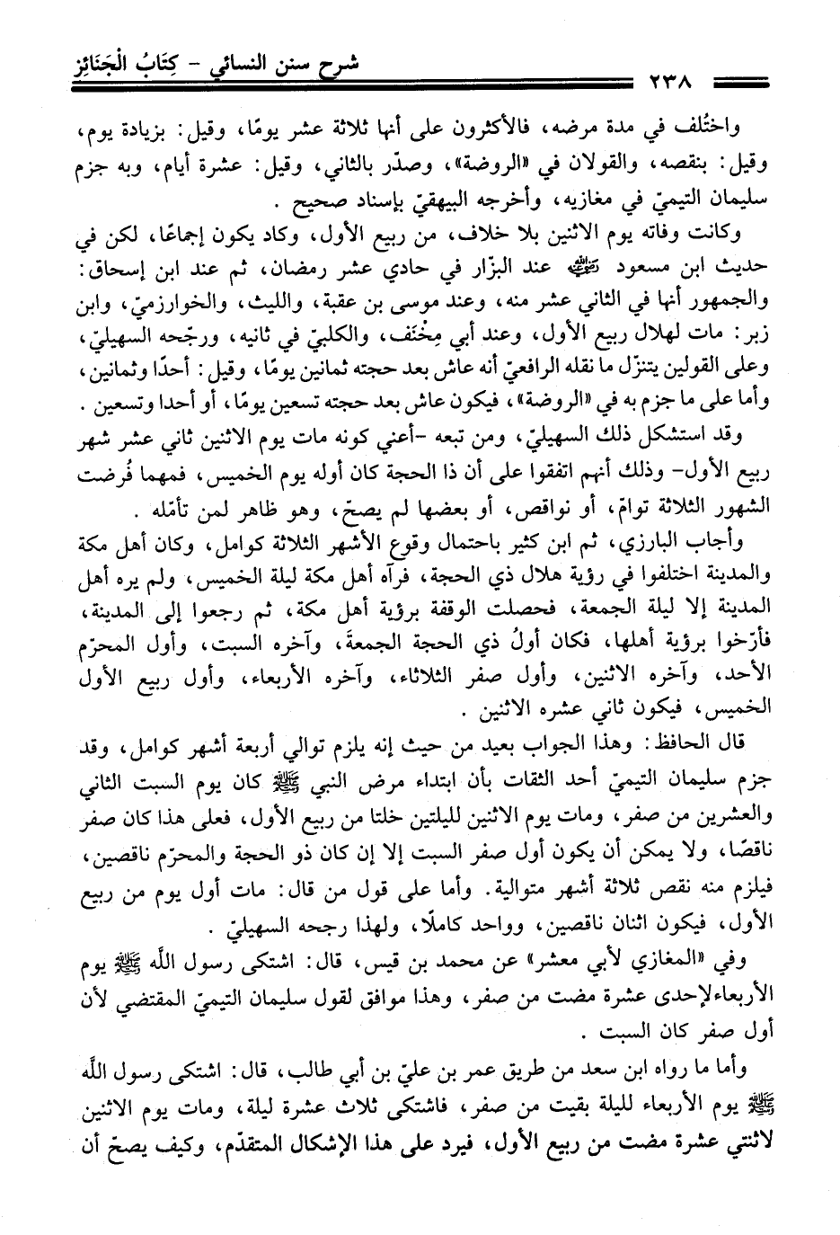 قال الحافظ: وهذا الجواب بعيد من حيث إنه يلزم توالي أربعة أشهر كوامل، وقد جزم سليمان التيميّ أحد الثقات بأن ابتداء مرض النبي - صلى اللَّه عليه وسلم - كان يوم السبت الثاني والعشرين من صفر، ومات يوم الاثنين لليلتين خلتا من ربيع الأول، فعلى هذا كان صفر ناقصًا، ولا يمكن أن يكون أول صفر السبت إلا إن كان ذو الحجة والمحرّم ناقصين، فيلزم منه نقص ثلاثة أشهر متوالية. وأما على قول من قال: مات أول يوم من ربيع الأول، فيكون اثنان ناقصين، وواحد كاملاً، ولهذا رجحه السهيليّ.