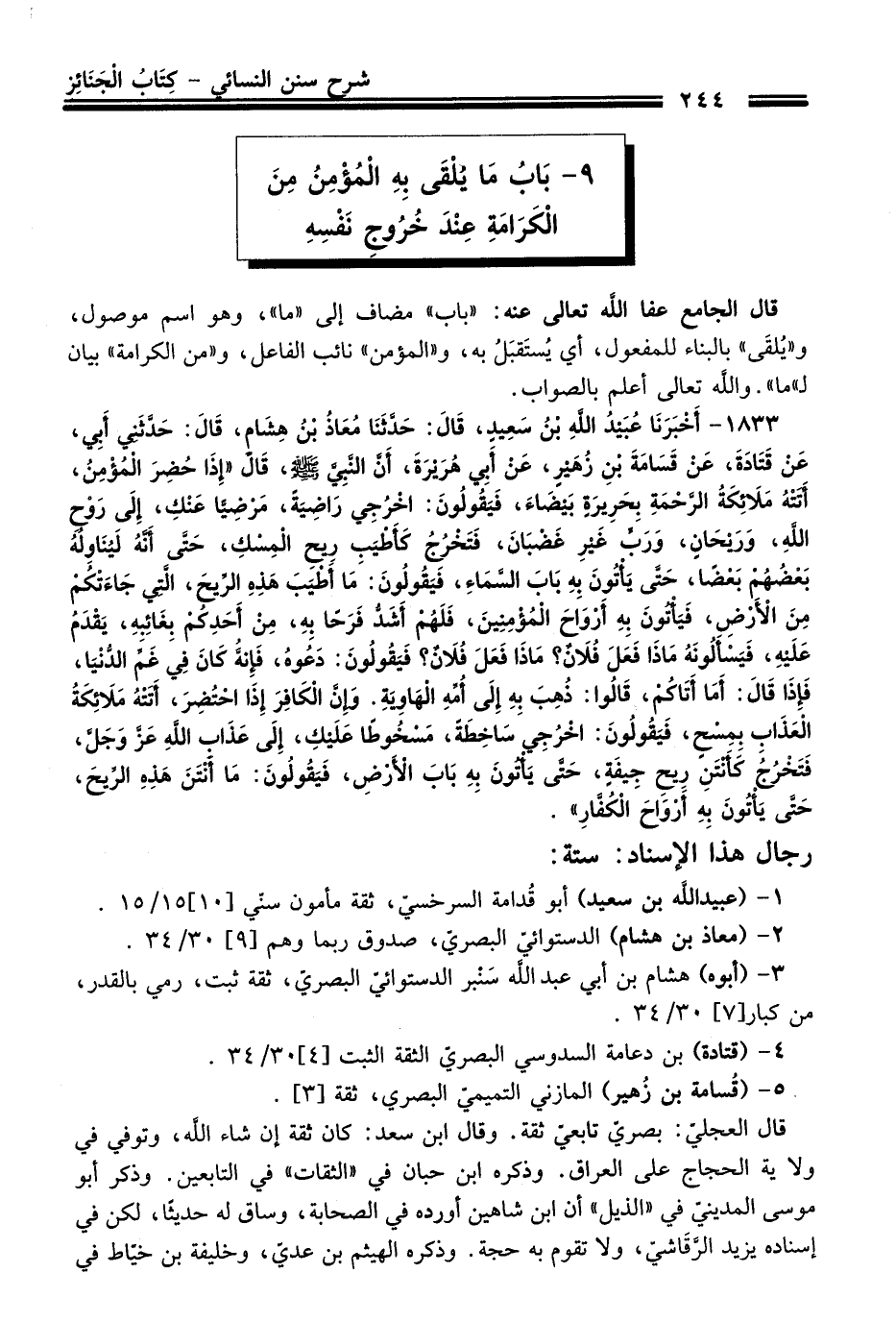 1833 - أَخْبَرَنَا عُبَيْدُ اللَّهِ بْنُ سَعِيدٍ, قَالَ: حَدَّثَنَا مُعَاذُ بْنُ هِشَامٍ, قَالَ: حَدَّثَنِي أَبِي, عَنْ قَتَادَةَ, عَنْ قَسَامَةَ بْنِ زُهَيْرٍ, عَنْ أَبِي هُرَيْرَةَ, أَنَّ النَّبِيَّ - صلى اللَّه عليه وسلم -, قَالَ: "إِذَا حُضِرَ الْمُؤْمِنُ, أَتَتْهُ مَلاَئِكَةُ الرَّحْمَةِ بِحَرِيرَةٍ بَيْضَاءَ, فَيَقُولُونَ: اخْرُجِي رَاضِيَةً, مَرْضِيًّا عَنْكِ, إِلَى رَوْحِ اللَّهِ, وَرَيْحَانٍ, وَرَبٍّ غَيْرِ غَضْبَانَ, فَتَخْرُجُ كَأَطْيَبِ رِيحِ الْمِسْكِ, حَتَّى أَنَّهُ لَيُنَاوِلُهُ بَعْضُهُمْ بَعْضًا, حَتَّى يَأْتُونَ بِهِ بَابَ السَّمَاءِ, فَيَقُولُونَ: مَا أَطْيَبَ هَذِهِ الرِّيحَ, الَّتِي جَاءَتْكُمْ مِنَ الأَرْضِ, فَيَأْتُونَ بِهِ أَرْوَاحَ الْمُؤْمِنِينَ, فَلَهُمْ أَشَدُّ فَرَحًا بِهِ, مِنْ أَحَدِكُمْ بِغَائِبِهِ, يَقْدَمُ عَلَيْهِ, فَيَسْأَلُونَهُ مَاذَا فَعَلَ فُلاَنٌ؟ مَاذَا فَعَلَ فُلاَنٌ؟ فَيَقُولُونَ: دَعُوهُ, فَإِنَّهُ كَانَ فِي غَمِّ الدُّنْيَا, فَإِذَا قَالَ: أَمَا أَتَاكُمْ, قَالُوا: ذُهِبَ بِهِ إِلَى أُمِّهِ الْهَاوِيَةِ. وَإِنَّ الْكَافِرَ إِذَا احْتُضِرَ, أَتَتْهُ مَلاَئِكَةُ الْعَذَابِ بِمِسْحٍ, فَيَقُولُونَ: اخْرُجِي سَاخِطَةً, مَسْخُوطًا عَلَيْكِ, إِلَى عَذَابِ اللَّهِ -عَزَّ وَجَلَّ-, فَتَخْرُجُ كَأَنْتَنِ رِيحِ جِيفَةٍ, حَتَّى يَأْتُونَ بِهِ بَابَ الأَرْضِ, فَيَقُولُونَ: مَا أَنْتَنَ هَذِهِ الرِّيحَ, حَتَّى يَأْتُونَ بِهِ أَرْوَاحَ الْكُفَّارِ".