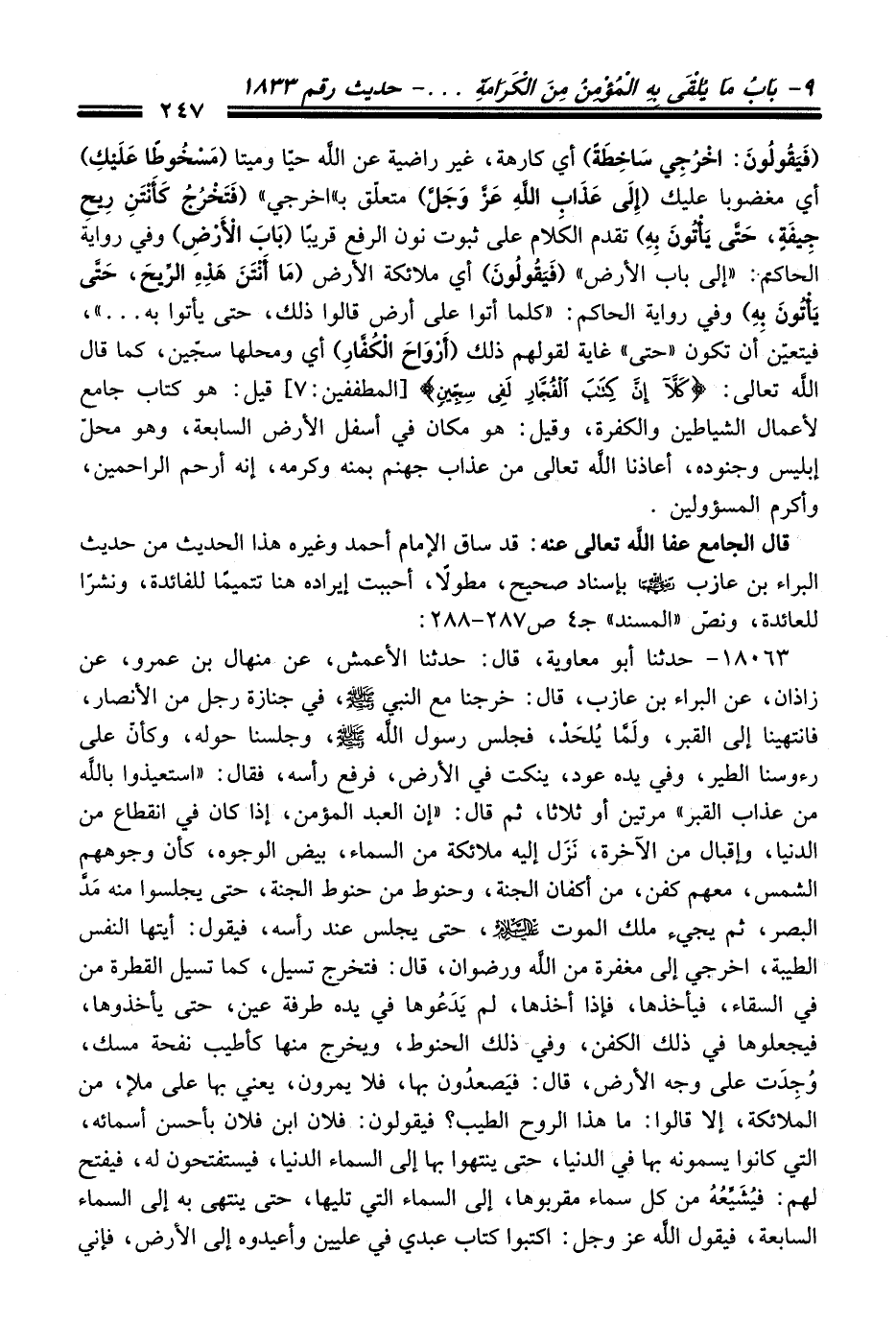 18063 - حدثنا أبو معاوية، قال: حدثنا الأعمش، عن منهال بن عمرو، عن زاذان، عن البراء بن عازب، قال: خرجنا مع النبي - صلى اللَّه عليه وسلم -، في جنازة رجل من الأنصار، فانتهينا إلى القبر، ولَمَّا يُلحَدْ، فجلس رسول اللَّه - صلى اللَّه عليه وسلم -، وجلسنا حوله، وكان على رءوسنا الطير، وفي يده عود، ينكت في الأرض، فرفع رأسه، فقال: "استعيذوا باللَّه من عذاب القبر" مرتين أو ثلاثا، ثم قال: "إن العبد المؤمن، إذا كان في انقطاع من الدنيا، وإقبال من الآخرة، نَزَل إليه ملائكة من السماء، بيض الوجوه، كأن وجوههم الشمس، معهم كفن، من أكفان الجنة، وحنوط من حنوط الجنة، حتى يجلسوا منه مَدَّ البصر، ثم يجيء ملك الموت - عليه السلام -، حتى يجلس عند رأسه، فيقول: أيتها النفس الطيبة، اخرجي إلى مغفرة من اللَّه ورضوان، قال: فتخرج تسيل، كما تسيل القطرة من في السقاء، فيأخذها، فإذا أخذها، لم يَدَعُوها في يده طرفة عين، حتى يأخذوها، فيجعلوها في ذلك الكفن، وفي ذلك الحنوط، ويخرج منها كأطيب نفحة مسك، وُجِدَت على وجه الأرض، قال: فيَصعدُون بها، فلا يمرون، يعني بها على ملإ، من الملائكة، إلا قالوا: ما هذا الروح الطيب؟ فيقولون: فلان ابن فلان بأحسن أسمائه، التي كانوا يسمونه بها في الدنيا، حتى ينتهوا بها إلى السماء الدنيا، فيستفتحون له، فيفتح لهم: فيُشَيِّعُهُ من كل سماء مقربوها، إلى السماء التي تليها، حتى ينتهى به إلى السماء السابعة، فيقول اللَّه -عَزَّ وَجَلَّ-: اكتبوا كتاب عبدي في عليين وأعيدوه إلى الأرض، فإني