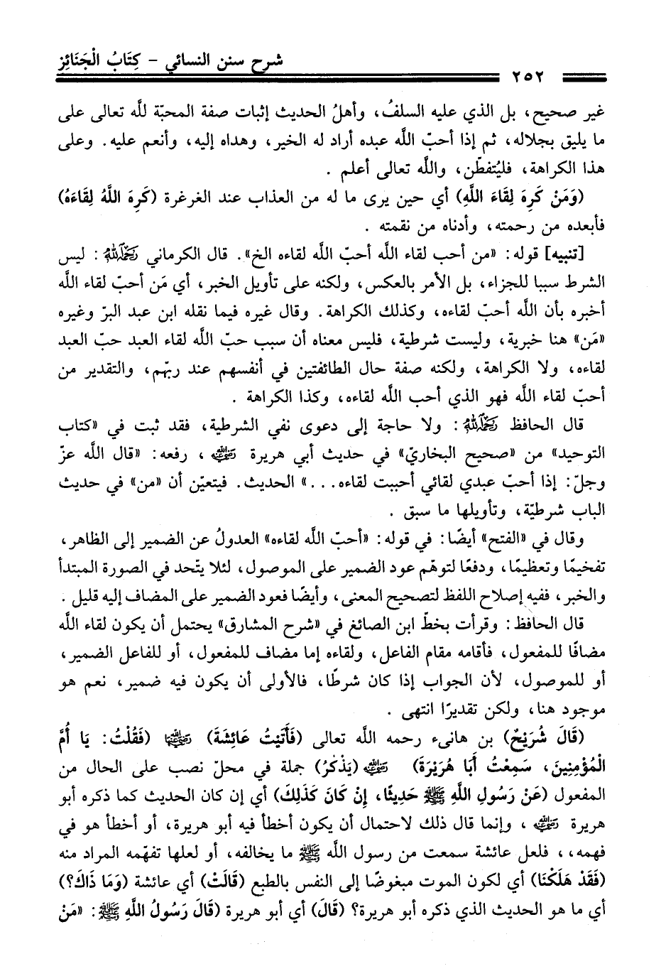 (قَالَ: شُرَيْحٌ) بن هانىء -رحمه اللَّه تعالى- (فَأتَيْتُ عَائِشَةَ) - رضي اللَّه عنها - (فَقُلْتُ: يَا أُمَّ الْمُؤْمِنِينَ، سَمِعْتُ أَبَا هُرَيْرَةَ) - رضي اللَّه عنه - (يَذْكُرُ) جملة في محلّ نصب على الحال من المفعول (عَنْ رَسُولِ اللَّهِ - صلى اللَّه عليه وسلم - حَدِيثًا، إِنْ كَانَ كَذَلِكَ) أي إن كان الحديث كما ذكره أبو هريرة - رضي اللَّه عنه -، وإنما قال ذلك لاحتمال أن يكون أخطأ فيه أبو هريرة، أو أخطأ هو في فهمه،، فلعل عائشة سمعت من رسول اللَّه - صلى اللَّه عليه وسلم - ما يخالفه، أو لعلها تفهّمه المراد منه (فَقَدْ هَلَكْنَا) أي لكون الموت مبغوضًا إلى النفس بالطبع (قَالَتْ:) أي عائشة (وَمَا ذَاكَ؟) أي ما هو الحديث الذي ذكره أبو هريرة؟ (قَالَ) أي أبو هريرة (قَالَ رَسُولُ اللَّهِ - صلى اللَّه عليه وسلم -: "مَنْ