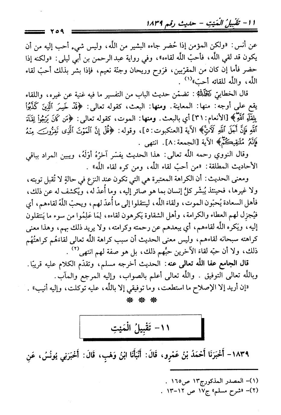 وقال النووي -رحمه اللَّه تعالى-: هذا الحديث يفسّر آخرُهُ أوّلَهُ، ويبين المراد بباقي الأحاديث المطلقة: "من أحبّ لقاء اللَّه، ومن كره لقاء اللَّه".