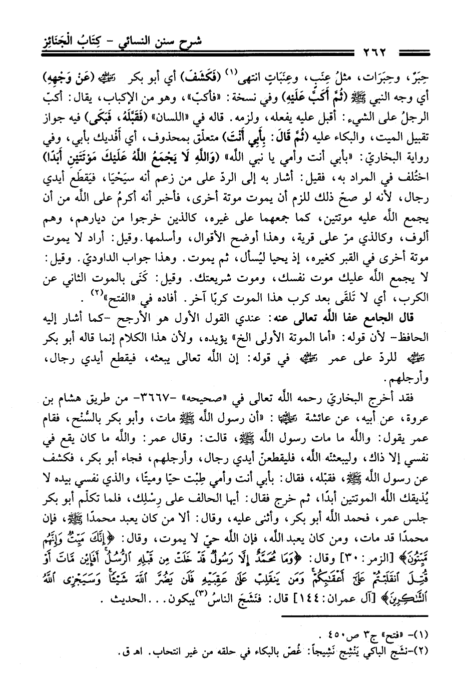 فقد أخرج البخاريّ -رحمه اللَّه تعالى- في "صحيحه"-3667 - من طريق هشام بن عروة، عن أبيه، عن عائشة - رضي اللَّه عنها -: "أن رسول اللَّه - صلى اللَّه عليه وسلم - مات، وأبو بكر بالسُّنْح، فقام عمر يقول: واللَّه ما مات رسول اللَّه - صلى اللَّه عليه وسلم -، قالت: وقال عمر: واللَّه ما كان يقع في نفسي إلا ذاك، وليبعثنّه اللَّه، فليقطعنّ أيدي رجال، وأرجلهم، فجاء أبو بكر، فكشف عن رسول اللَّه - صلى اللَّه عليه وسلم -، فقبله، فقال: بأبي أنت وأمي طِبْت حيّا وميتًا، والذي نفسي بيده لا يُذيقك اللَّه الموتتين أبدًا، ثم خرج فقال: أيها الحالف على رِسْلِك، فلما تكلّم أبو بكر جلس عمر، فحمد اللَّه أبو بكر، وأثنى عليه، وقال: ألا من كان يعبد محمدًا - صلى اللَّه عليه وسلم -، فإن محمدًا قد مات، ومن كان يعبد اللَّه، فإن اللَّه حي لا يموت، وقال: {إِنَكَ مَيتٌ وإِنَهُم مَّيِّتُونَ} [الزمر: 30] وقال: {وَمَا مُحَمَّدٌ إِلَّا رَسُولٌ قَدْ خَلَتْ مِنْ قَبْلِهِ الرُّسُلُ أَفَإِنْ مَاتَ أَوْ قُتِلَ انْقَلَبْتُمْ عَلَى أَعْقَابِكُمْ وَمَنْ يَنْقَلِبْ عَلَى عَقِبَيْهِ فَلَنْ يَضُرَّ اللَّهَ شَيْئًا وَسَيَجْزِي اللَّهُ الشَّاكِرِينَ} [آل عمران: 144]، قال: فنَشَجَ الناسُ (¬3) يبكون ... الحديث.